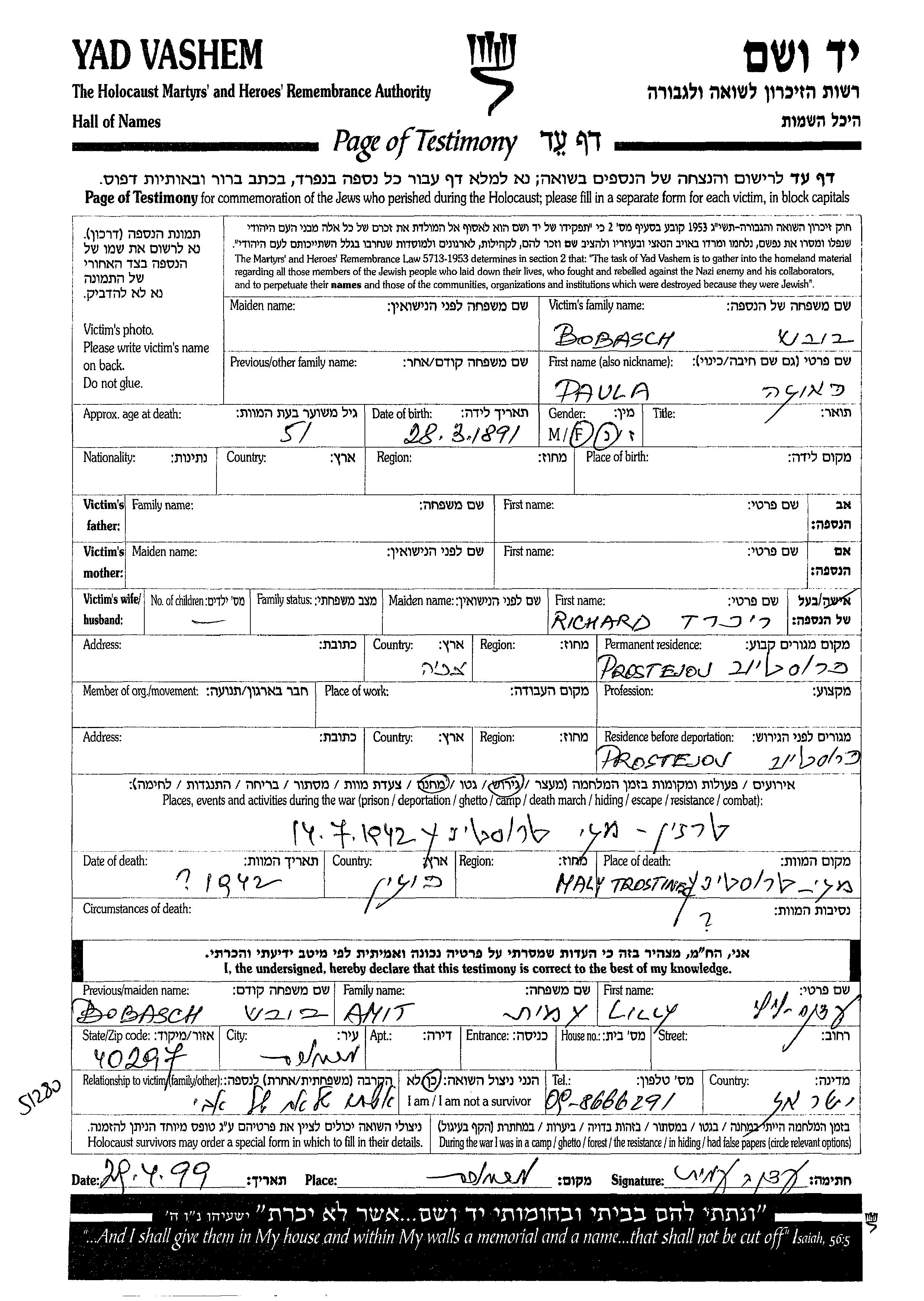 Paula Bobasch wurde im Jahr 1891 geboren. Sie war mit Richard Verheiratet. Vor dem Zweiten Weltkrieg lebte sie in Prostejov, Tschechoslowakei. Während des Krieges war sie in Prostejov, Tschechoslowakei.