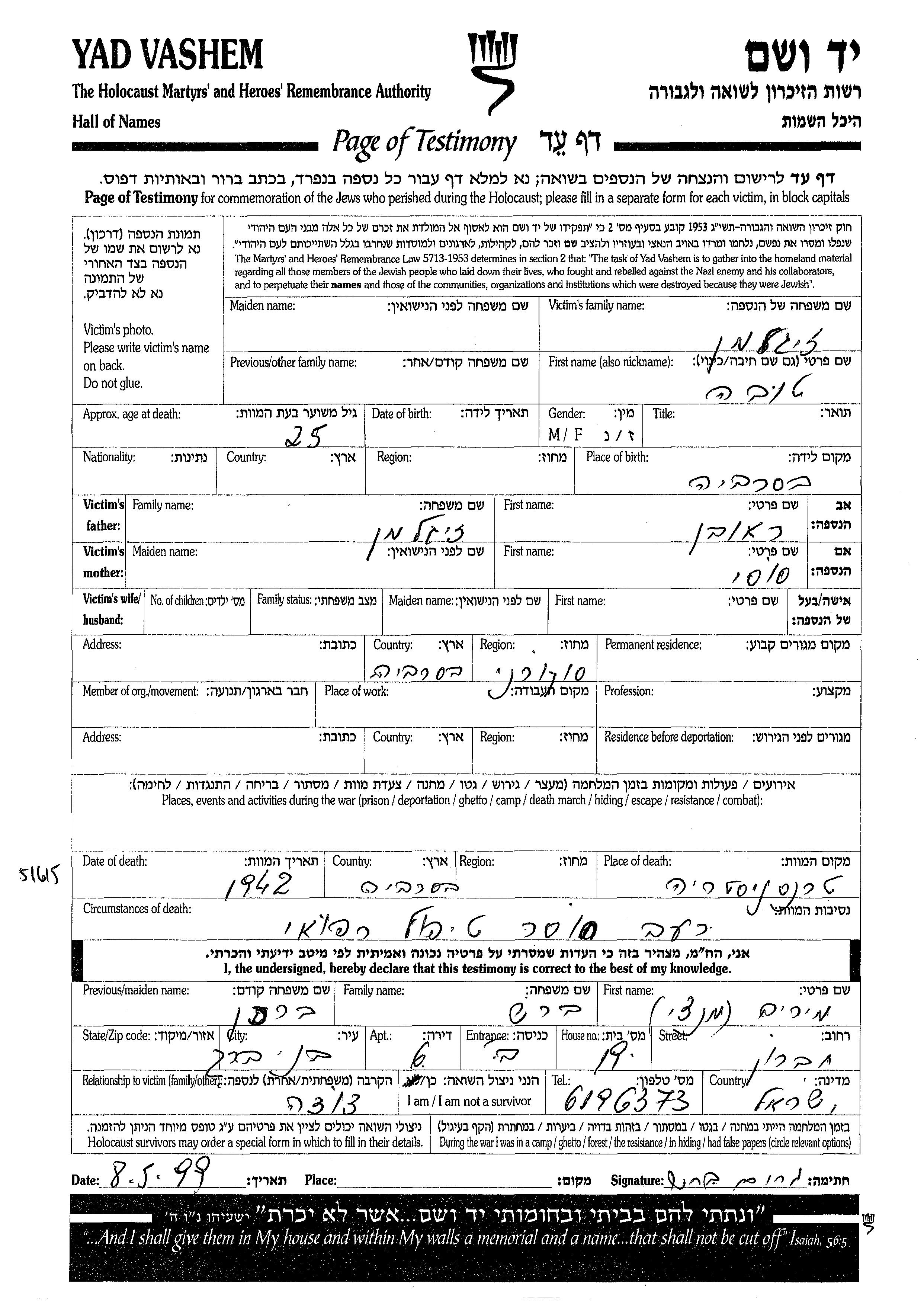 Tova wurde in der Schoah ermordet. Todesort: Transnistria, Ukraine (UdSSR) im Jahr 1942.