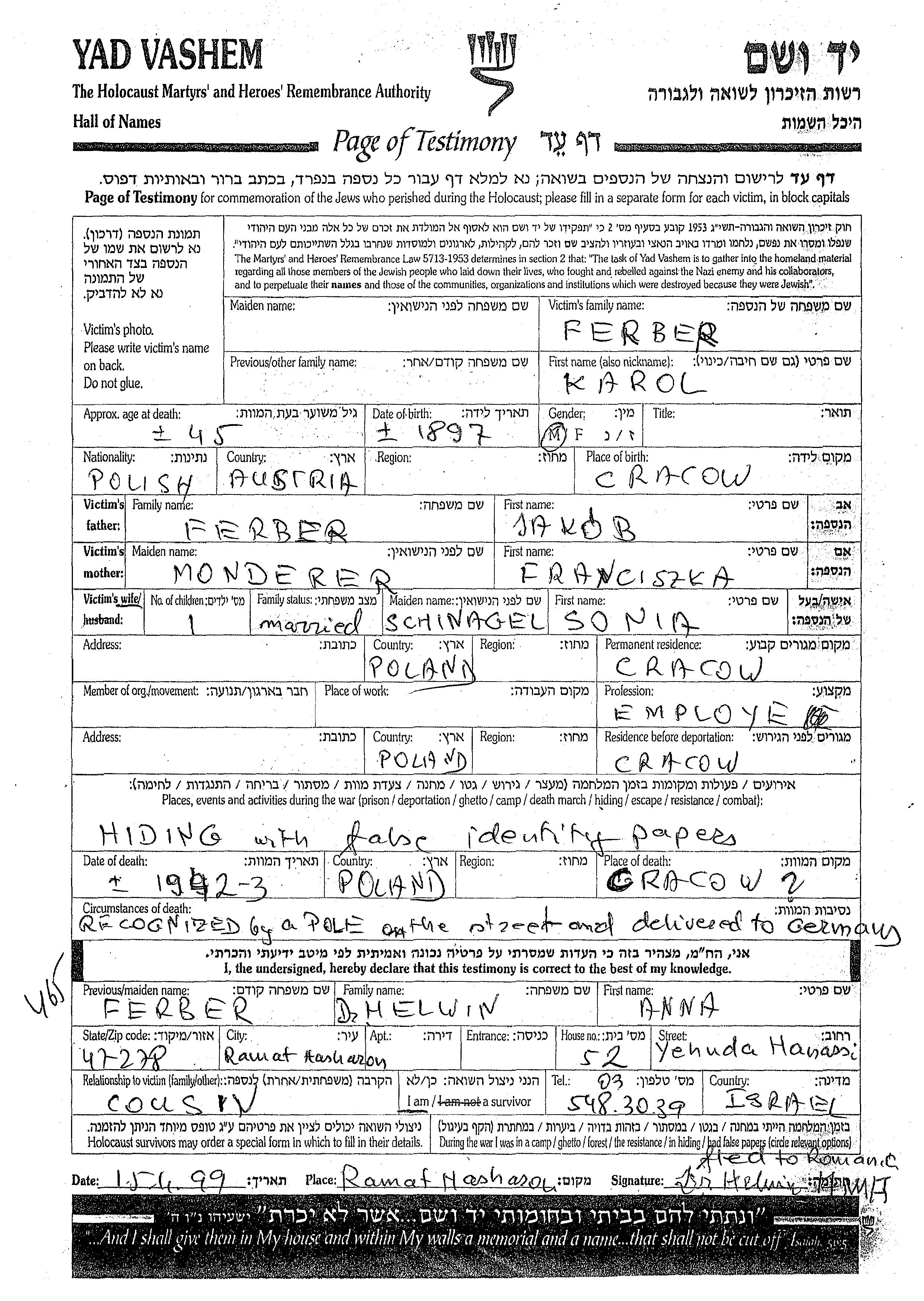 Karol Ferber wurde im Jahr 1897 in Cracow, Polen geboren. Er war der Sohn von Jakob und Franciszka. Er war Angestellter/angestellte und mit Sonia, geb. Schinagel Verwitwet. Vor dem Zweiten Weltkrieg lebte er in Cracow, Polen. Während des Krieges war er in Cracow, Polen.