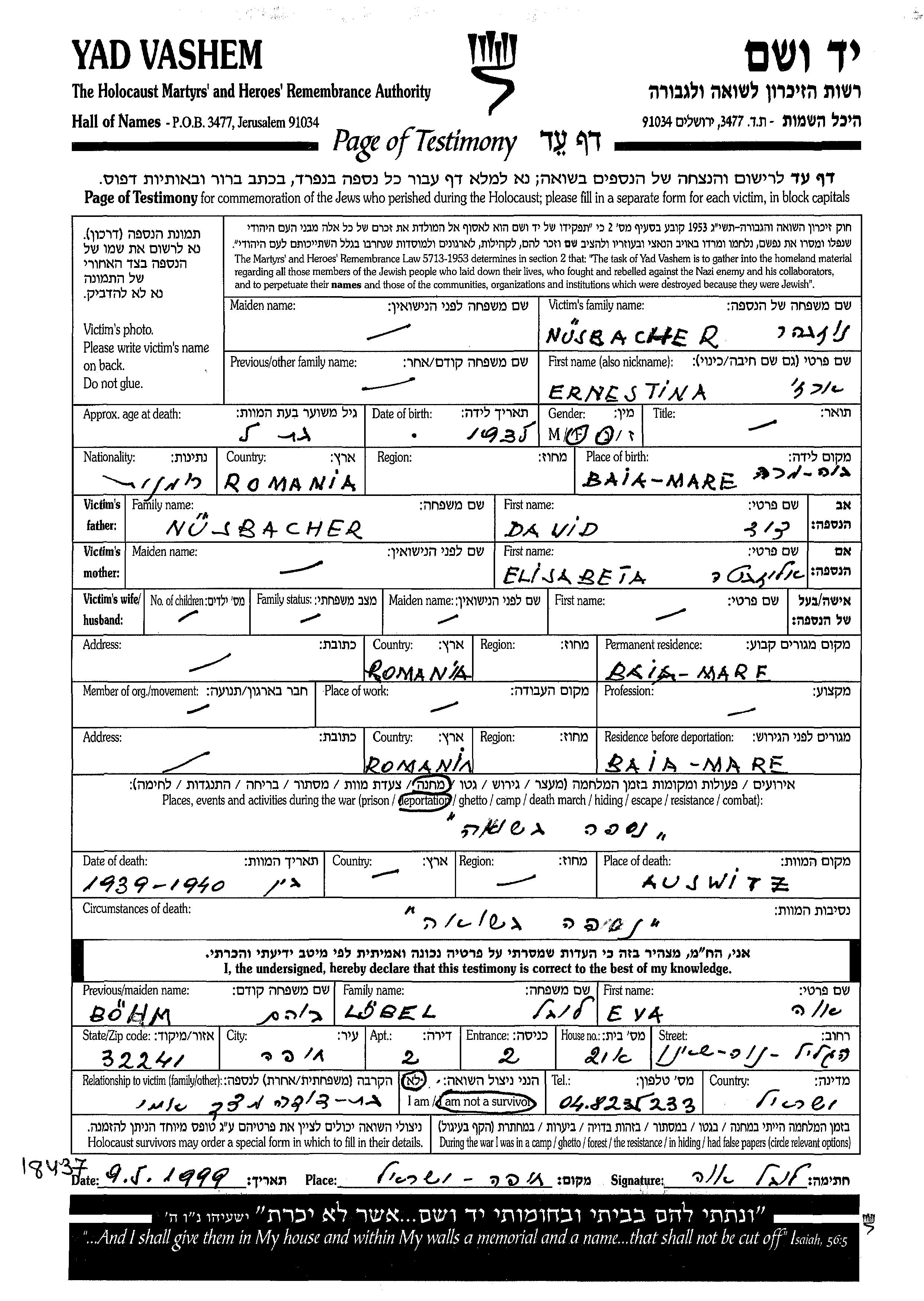 Ernestina Erzhi Nusbacher wurde im Jahr 1935 in Baia Mare, Rumänien geboren. Sie war die Tochter von Dawid und Elisabeta. Vor dem Zweiten Weltkrieg lebte sie in Baia Mare, Rumänien. Während des Krieges war sie in Baia Mare, Rumänien.