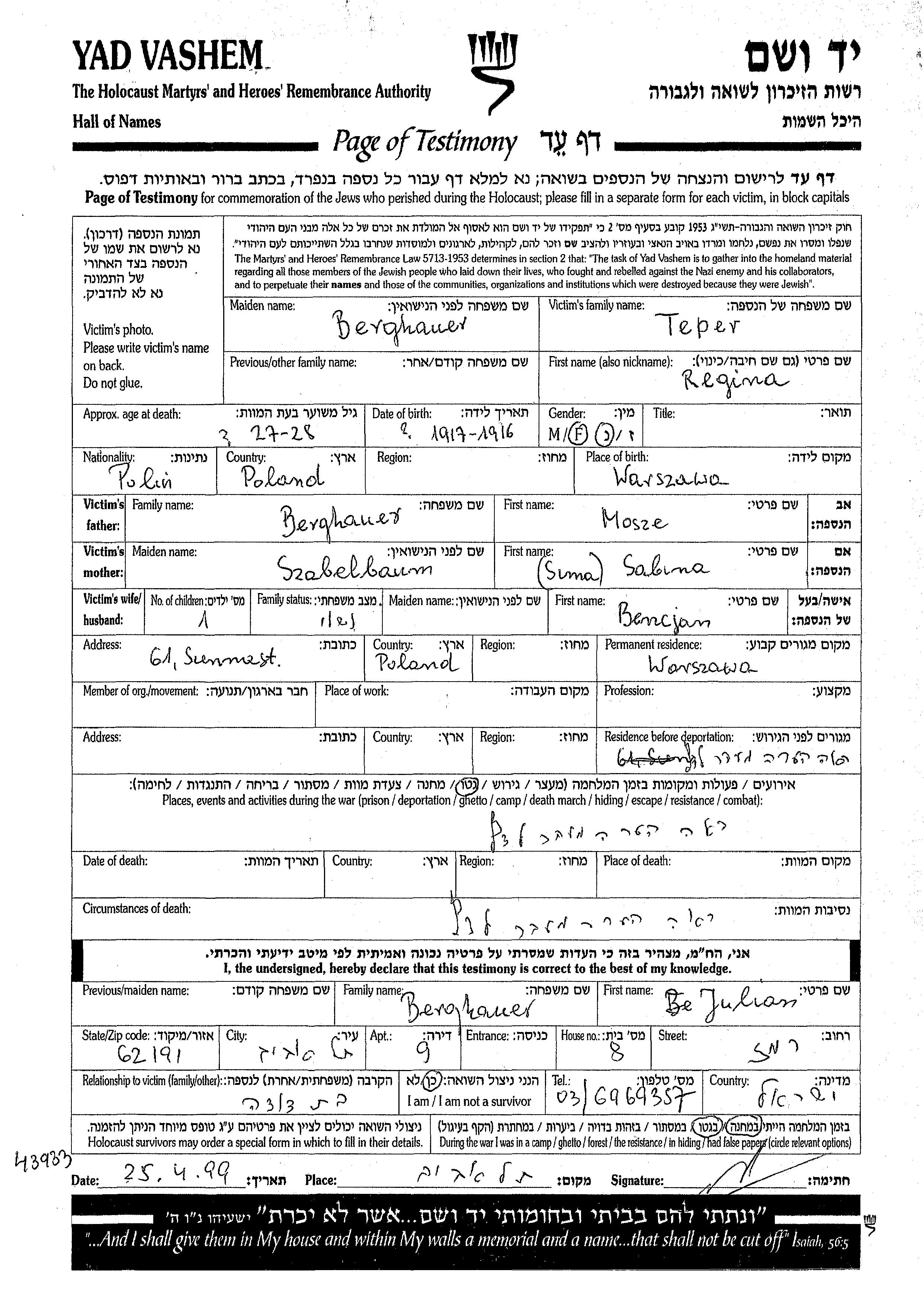 Regina Teper wurde im Jahr 1916 in Warsaw, Polen geboren. Sie war die Tochter von Mosze und Salina Shamai Sima Suma. Sie war mit Bencjon Verheiratet. Vor dem Zweiten Weltkrieg lebte sie in Warsaw, Polen.