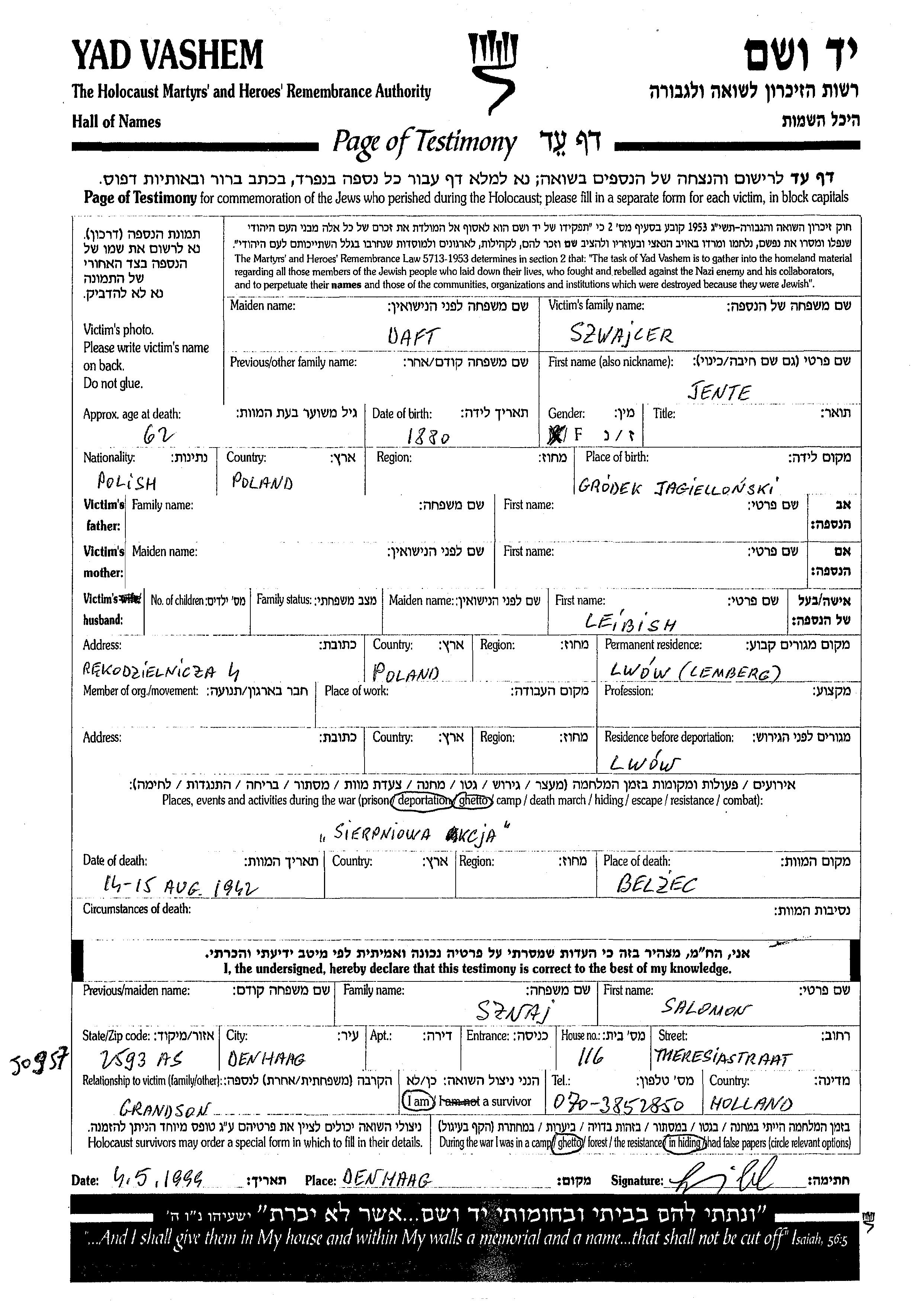 Jente Szwajcer, geb. Daft wurde im Jahr 1880 in Gródek, Polen geboren. Vor dem Zweiten Weltkrieg lebte sie in Lwow, Polen. Während des Krieges war sie in Lwow, Polen.
