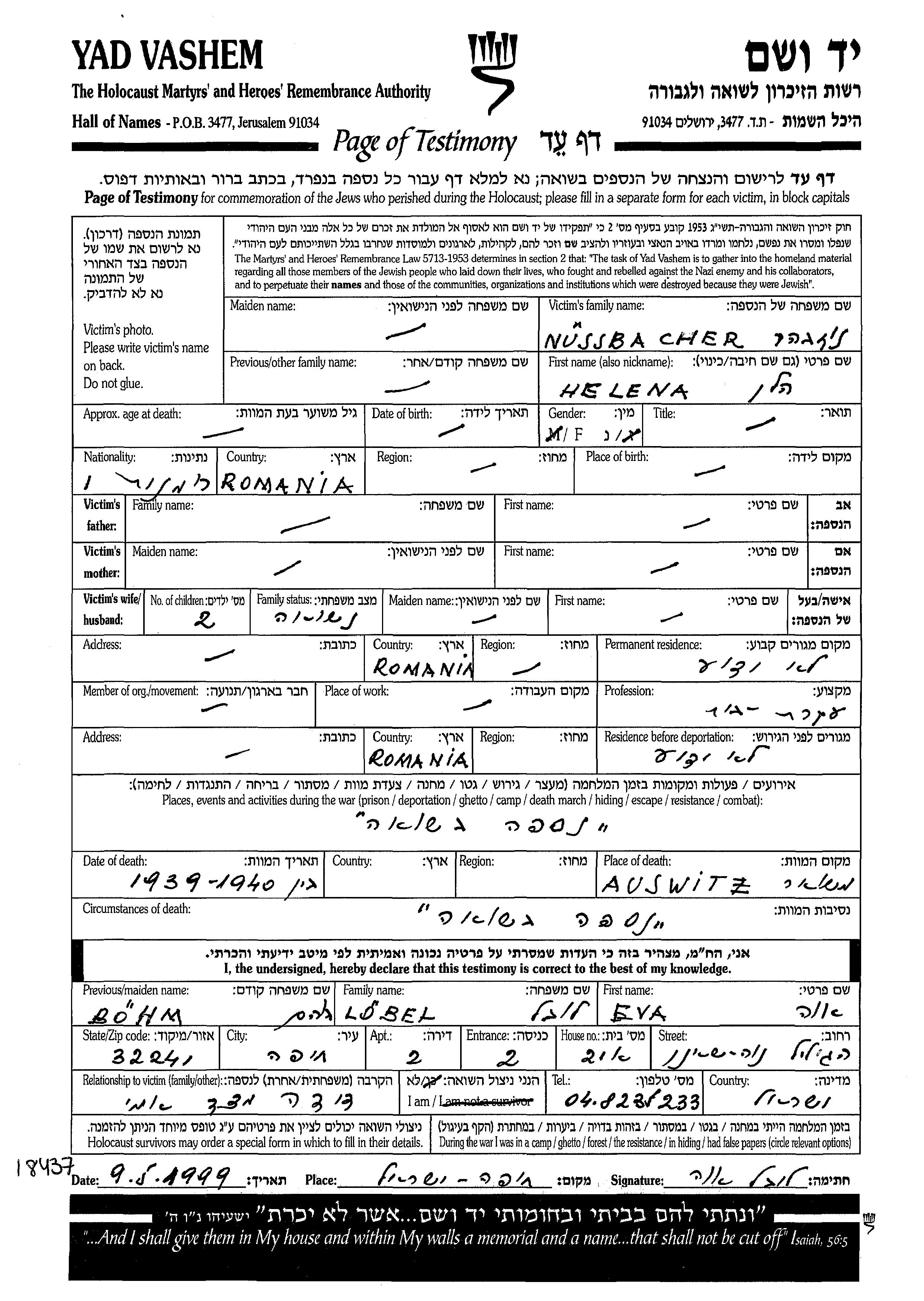Helen Nussbacher wurde in Rumänien geboren. Sie war Hausfrau und Verheiratet. Vor dem Zweiten Weltkrieg lebte sie in Rumänien. Während des Krieges war sie in Rumänien.