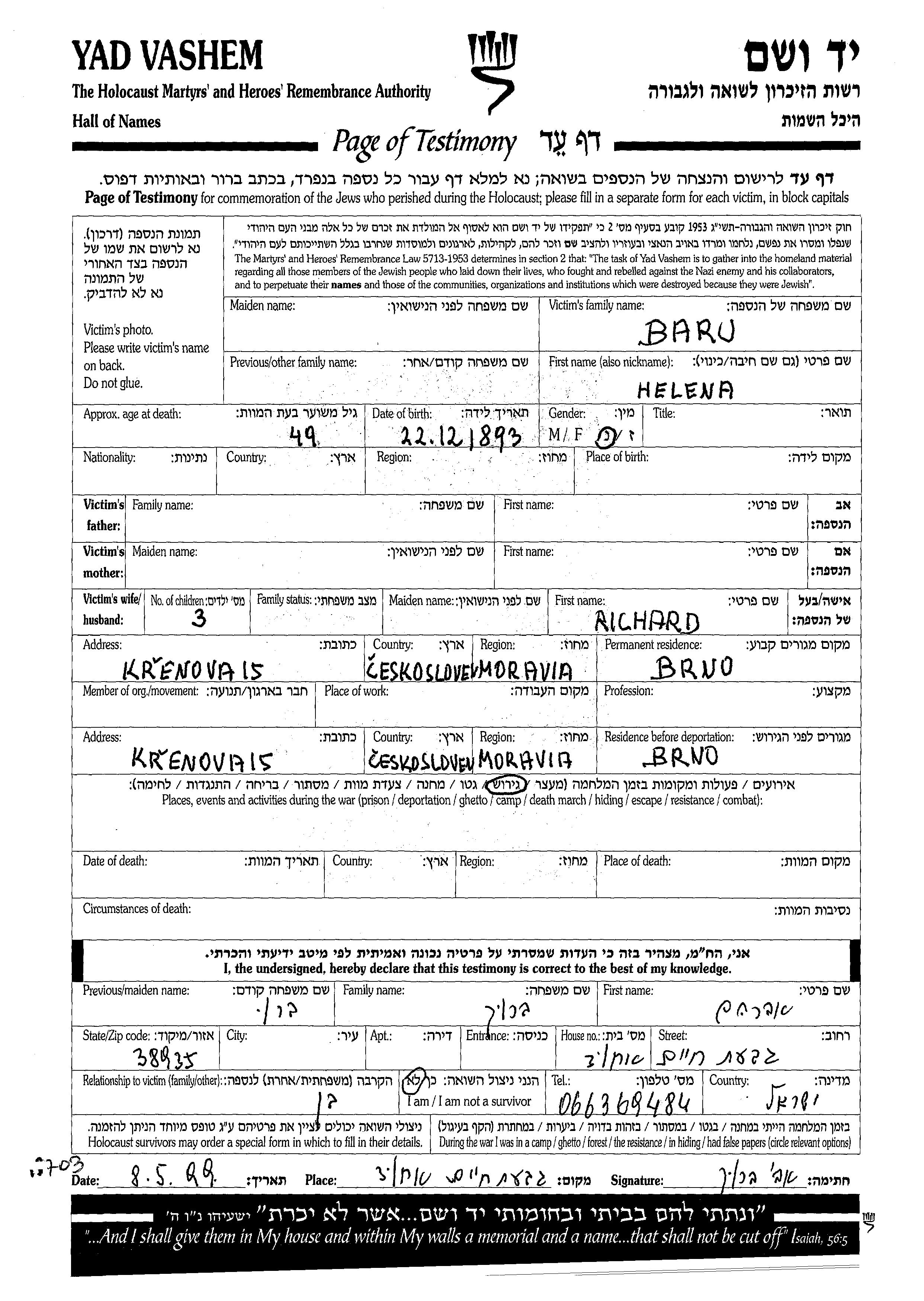 Helena Baru wurde im Jahr 1893 geboren. Sie war mit Richard Verheiratet. Vor dem Zweiten Weltkrieg lebte sie in Brno, Tschechoslowakei. Während des Krieges war sie in Brno, Tschechoslowakei.