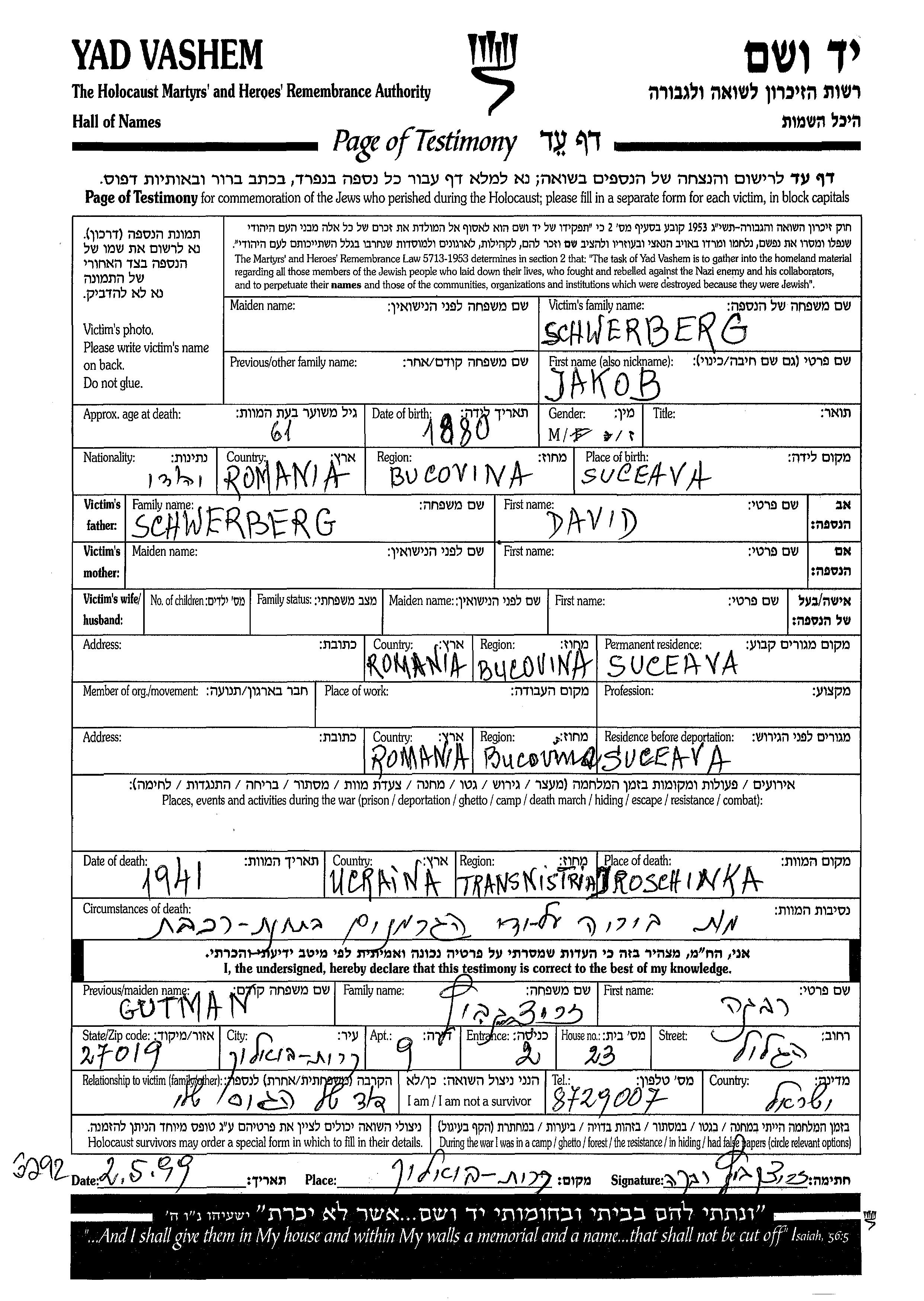 Jakob Schwerberg wurde im Jahr 1880 in Suceava, Rumänien geboren. Er war der Sohn von David. Vor dem Zweiten Weltkrieg lebte er in Suceava, Rumänien. Während des Krieges war er in Suceava, Rumänien.