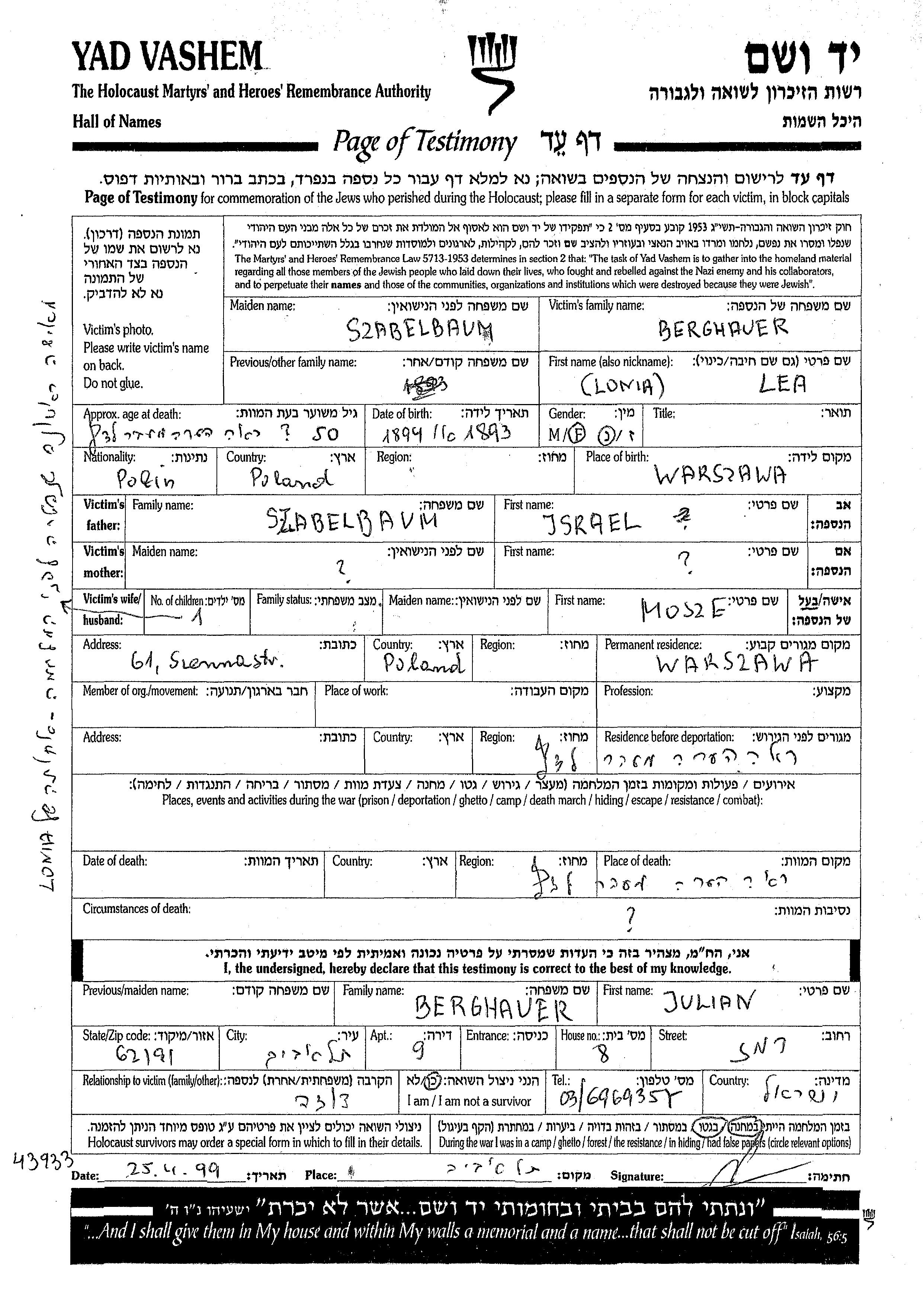 Lea Lonia Berghauer, geb. Szabelbaum wurde im Jahr 1893 in Warsaw, Polen geboren. Sie war die Tochter von Israel. Sie war mit Mosze Verheiratet. Vor dem Zweiten Weltkrieg lebte sie in Warsaw, Polen.