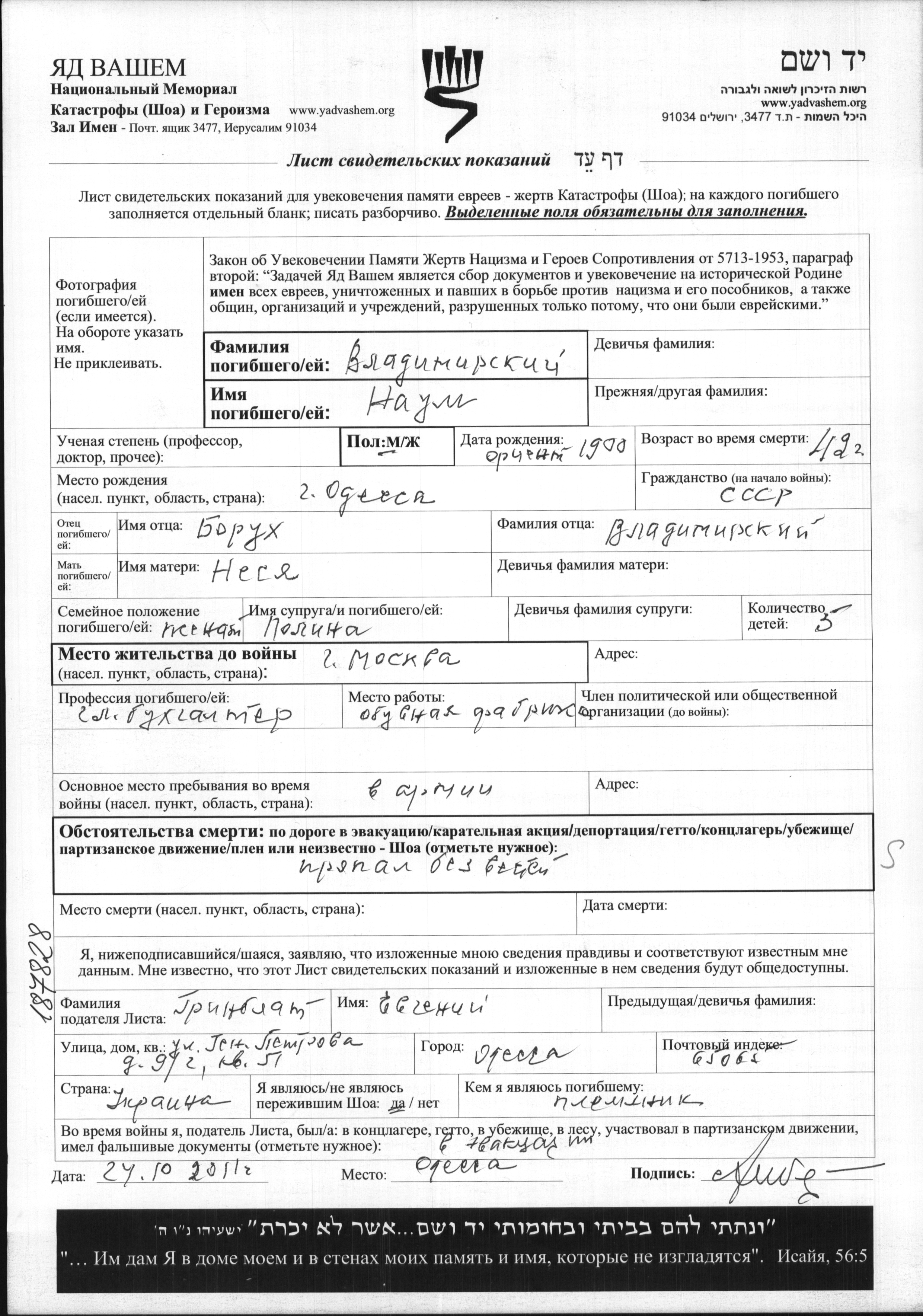 Naum Vladimirskiy wurde im Jahr 1900 in Odessa, Ukraine (UdSSR) geboren. Er war der Sohn von Borukh und Nesya. Er war Hauptbuchhalter und mit Polina Verheiratet. Vor dem Zweiten Weltkrieg lebte er in Moskva, Russland (UdSSR). Während des Krieges war er in die Sowjetischen Streitkräfte.