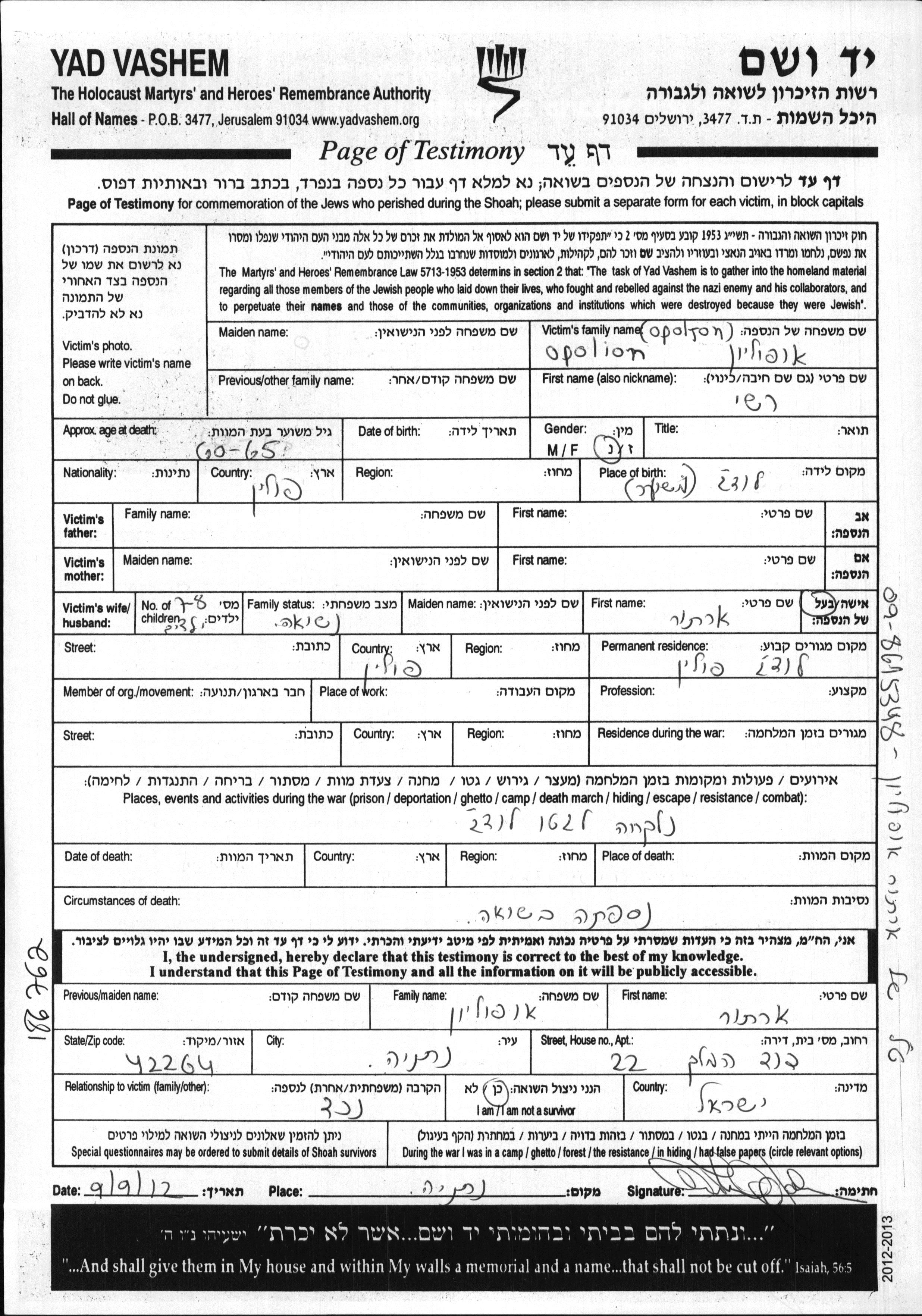 Rashi Opolion wurde in Lodz, Polen geboren. Sie war mit Artur Verheiratet. Vor dem Zweiten Weltkrieg lebte sie in Lodz, Polen. Während des Krieges war sie in Lodz, Polen.