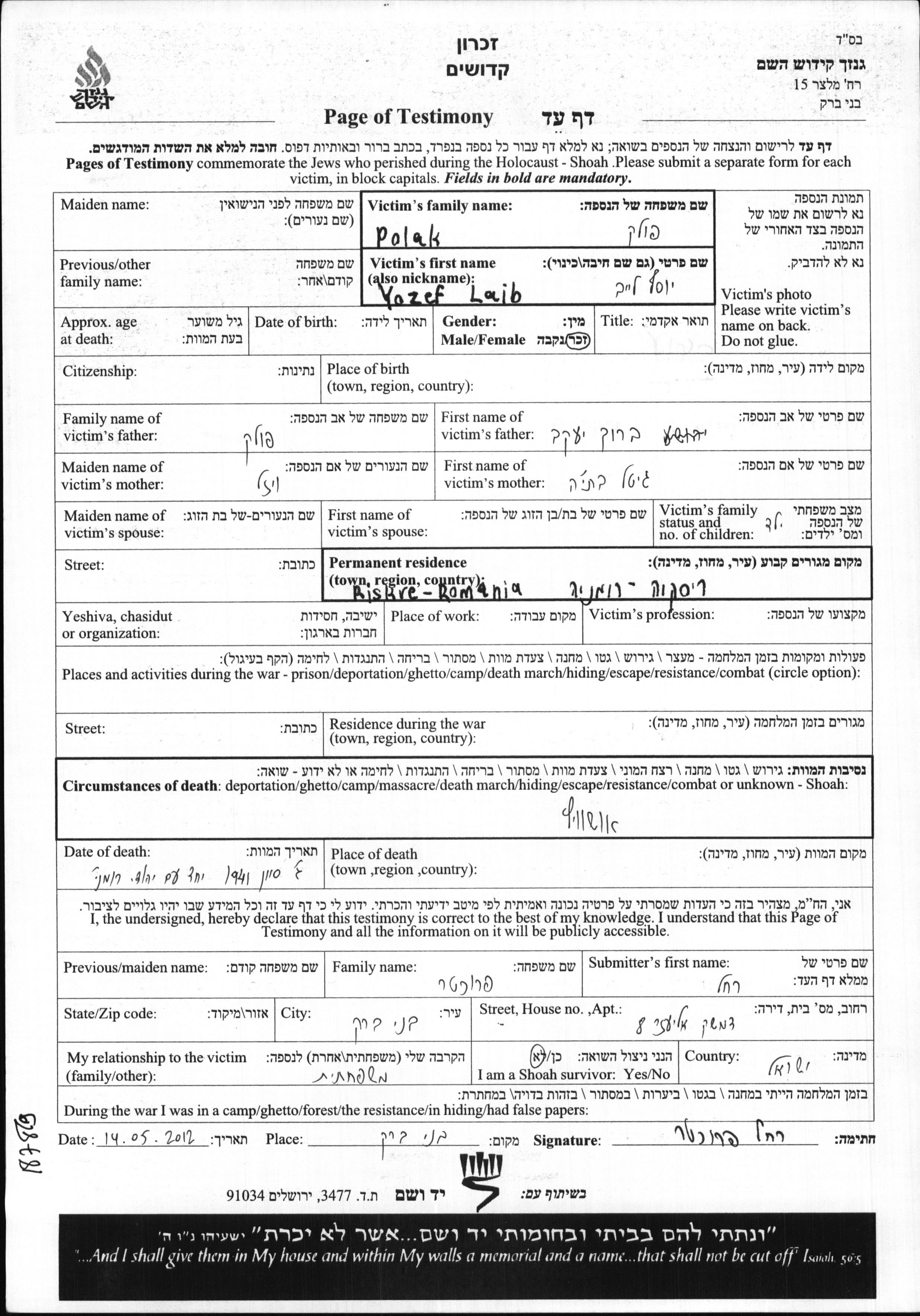 Yosef Laib Polak wurde Er war der Sohn von Baruch Yaakov und Gitel Batia, geb. Vizel. Er war Kind. Vor dem Zweiten Weltkrieg lebte er in Riskeve, Rumänien.