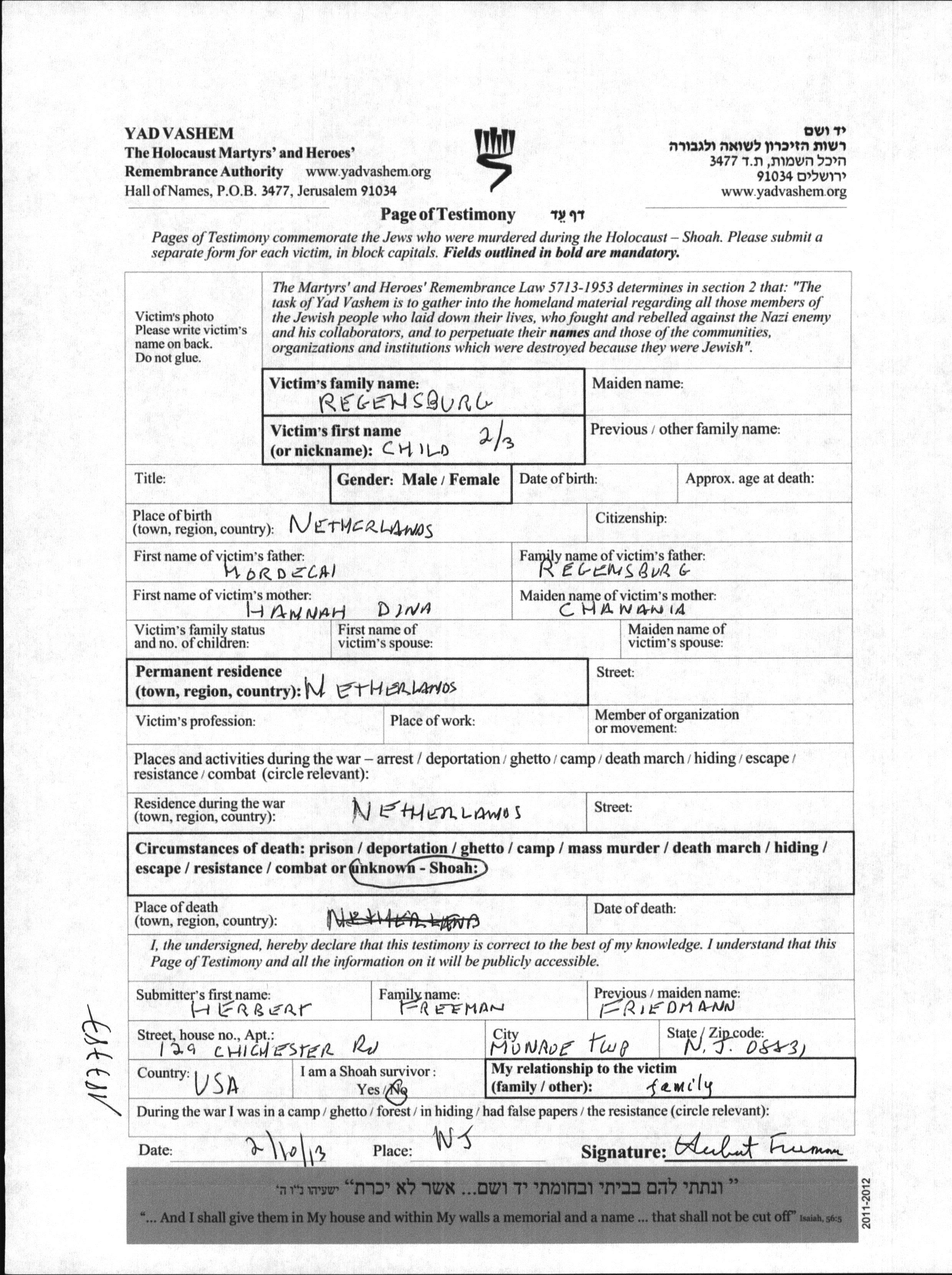 Vorname unbekannt Regensburg wurde in Niederlande geboren. Er/sie war der/ die Sohn/Tochter von Mordecai und Hannah Dina, geb. Chanania. Er/Sie war Kind. Vor dem Zweiten Weltkrieg er/sie in Niederlande. Während des Krieges war er/sie in Niederlande.