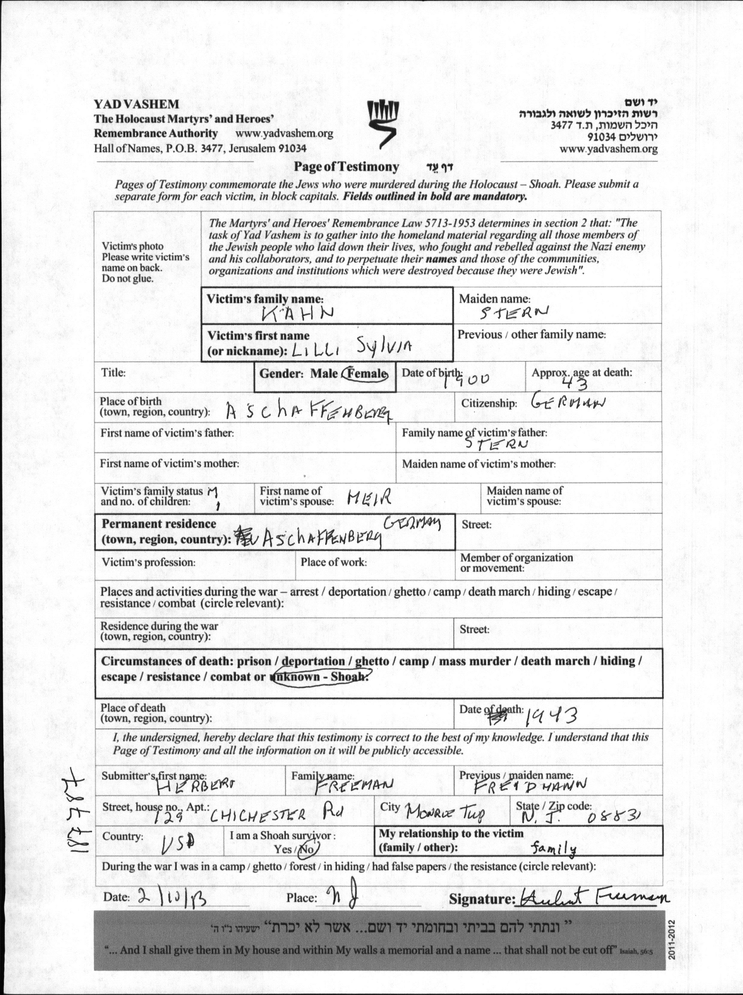 Lilli Sylvia Kahn, geb. Stern wurde im Jahr 1900 in Aschaffenburg, Deutsches Reich geboren. Sie war mit Meir Verheiratet. Vor dem Zweiten Weltkrieg lebte sie in Aschaffenburg, Deutsches Reich.