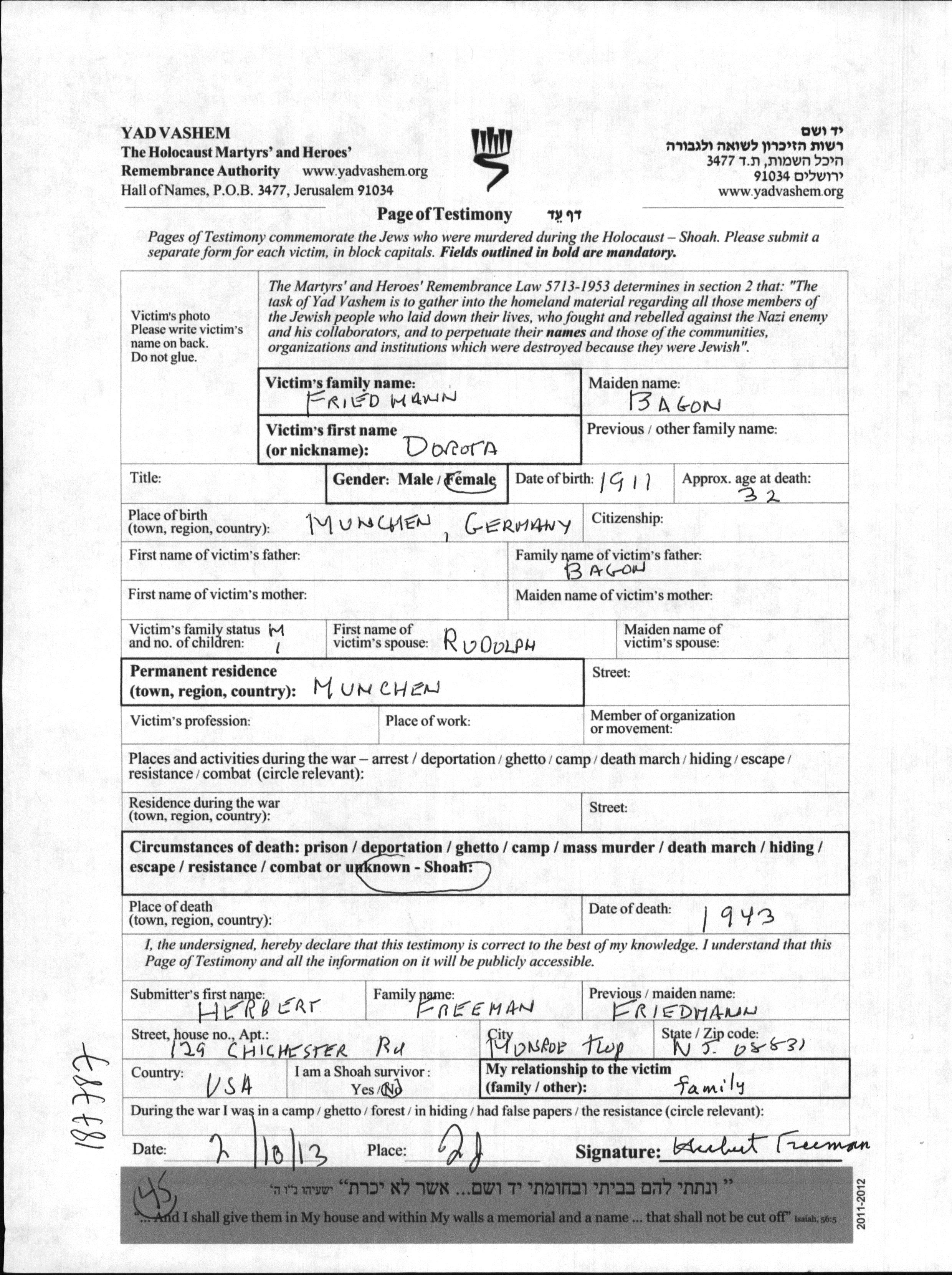 Dorota Friedmann, geb. Bagon wurde im Jahr 1911 in Munchen, Deutsches Reich geboren. Sie war mit Rudolph Verheiratet. Vor dem Zweiten Weltkrieg lebte sie in Muenchen, Deutsches Reich.