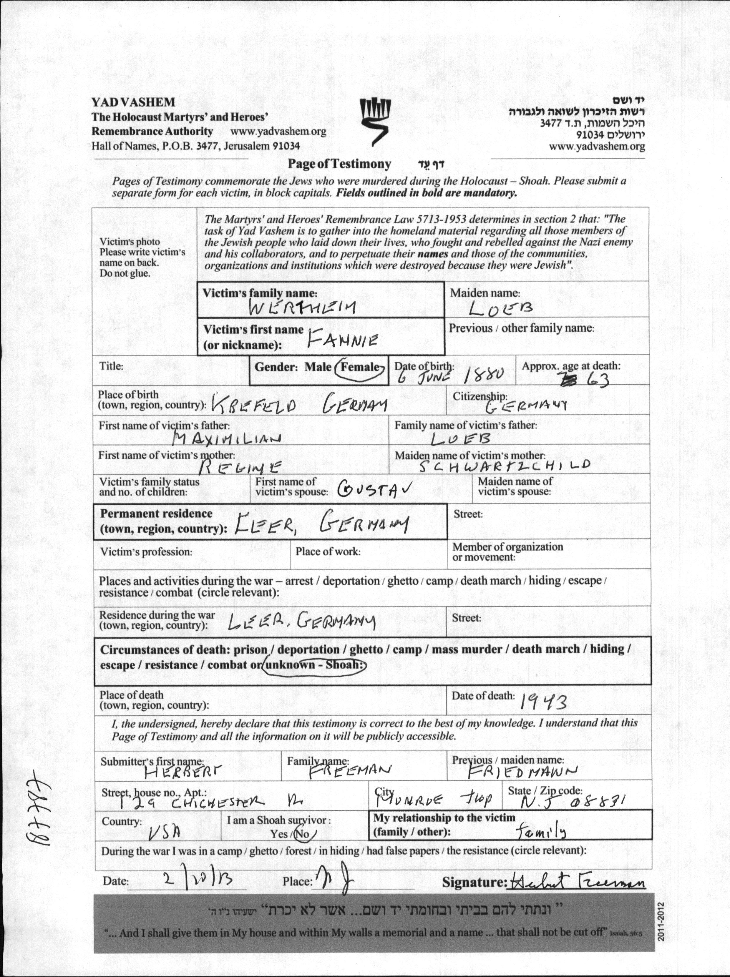 Fannie Wertheim, geb. Löb wurde im Jahr 1880 in Krefeld, Deutsches Reich geboren. Sie war die Tochter von Maximilian und Regine, geb. Schwarzchild. Sie war mit Gustav Verheiratet. Vor dem Zweiten Weltkrieg lebte sie in Leer, Deutsches Reich. Während des Krieges war sie in Leer, Deutsches Reich.