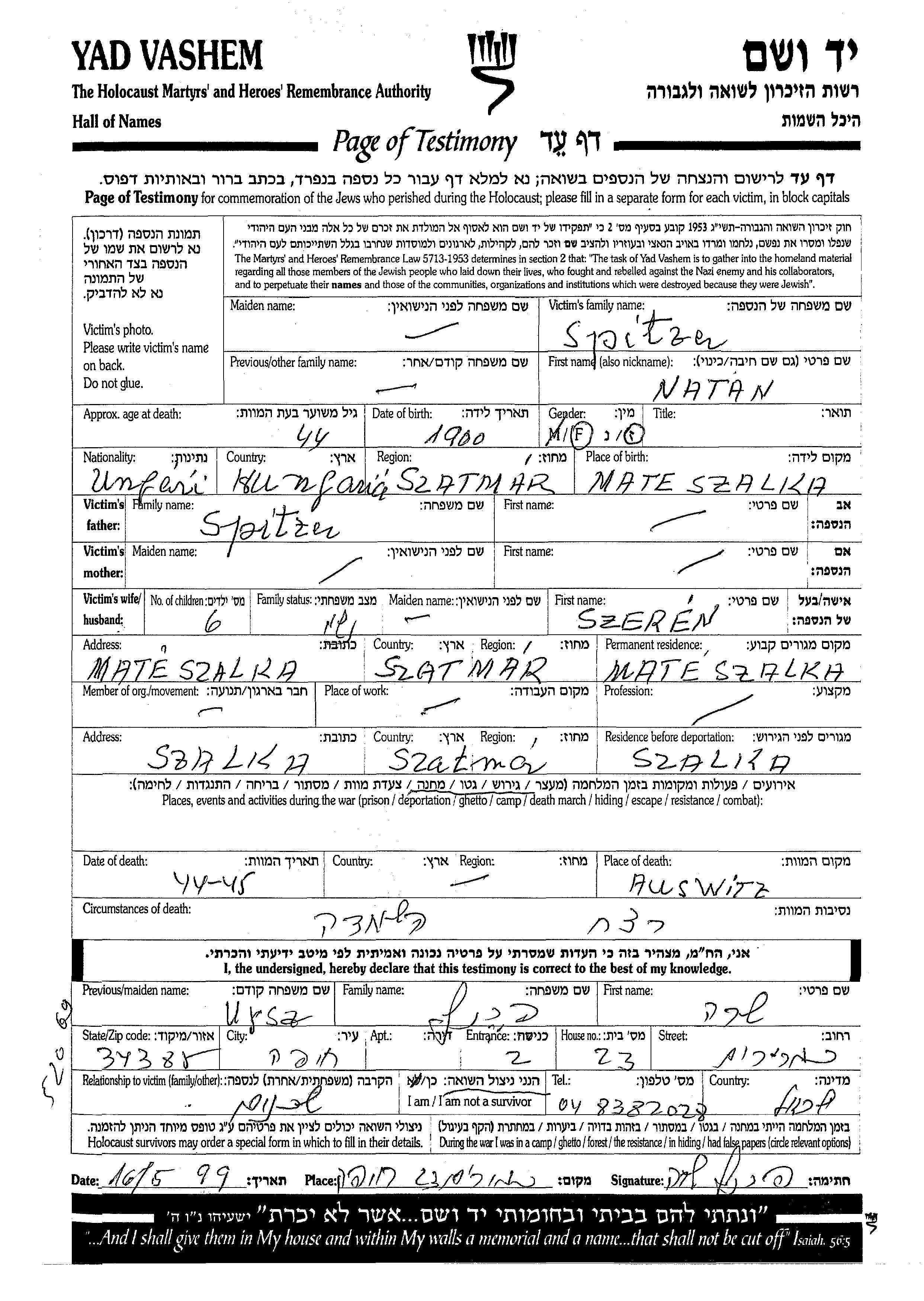 Natan Spitzer wurde im Jahr 1900 in Mate Szalka, Ungarn geboren. Er war mit Szeren Verheiratet. Vor dem Zweiten Weltkrieg lebte er in Mate Szalka, Ungarn. Während des Krieges war er in Mate Szalka, Ungarn.