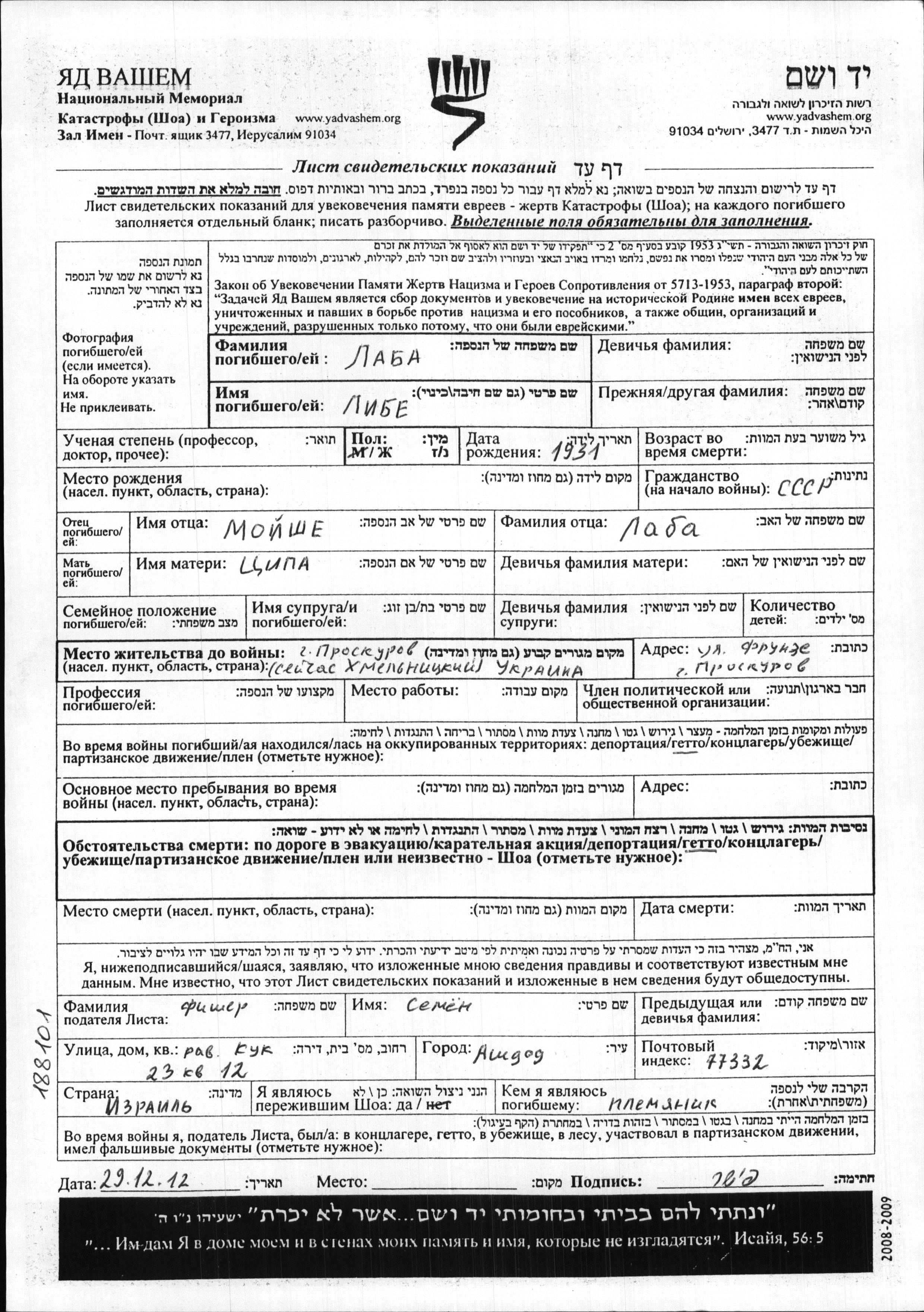 Libe wurde in der Schoah ermordet. Todesort: Proskurov, Ukraine (UdSSR).