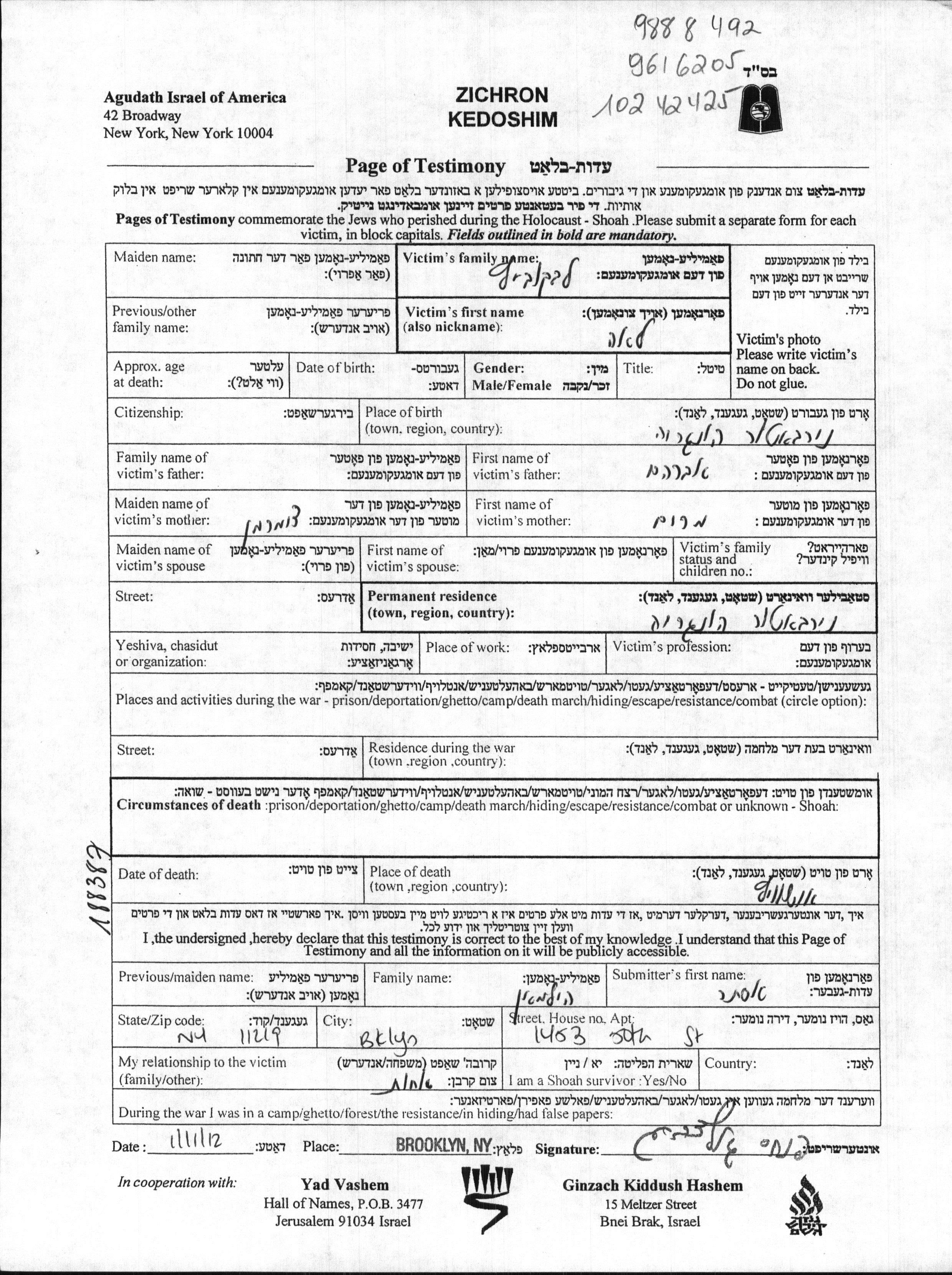 Levkovitz Lea Nyirbator, Ungarn Gedenkblatt