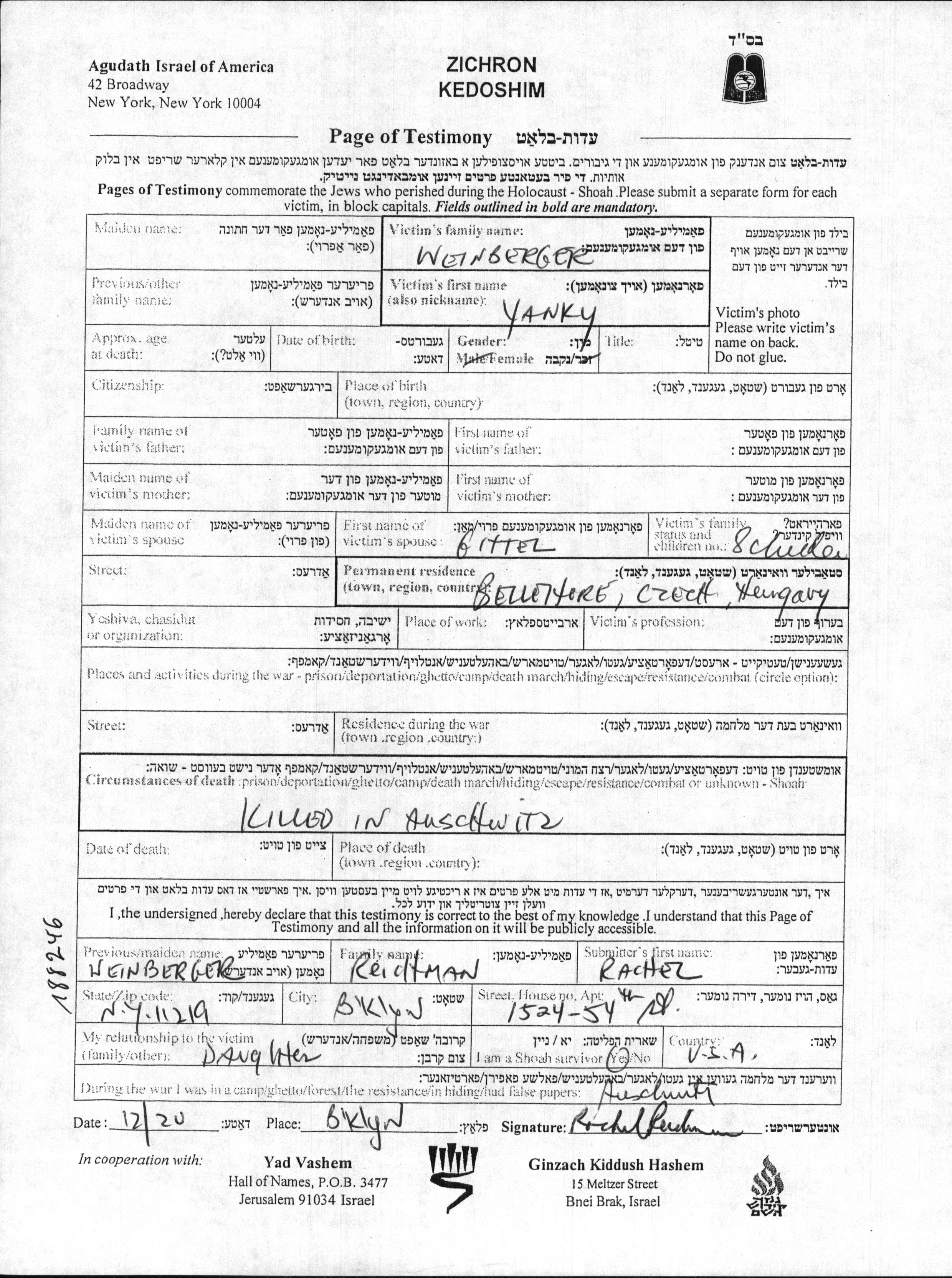 Yanky Weinberger. Er war mit Gittel Verheiratet. Vor dem Zweiten Weltkrieg lebte er in Undeciphered Place, Tschechoslowakei.