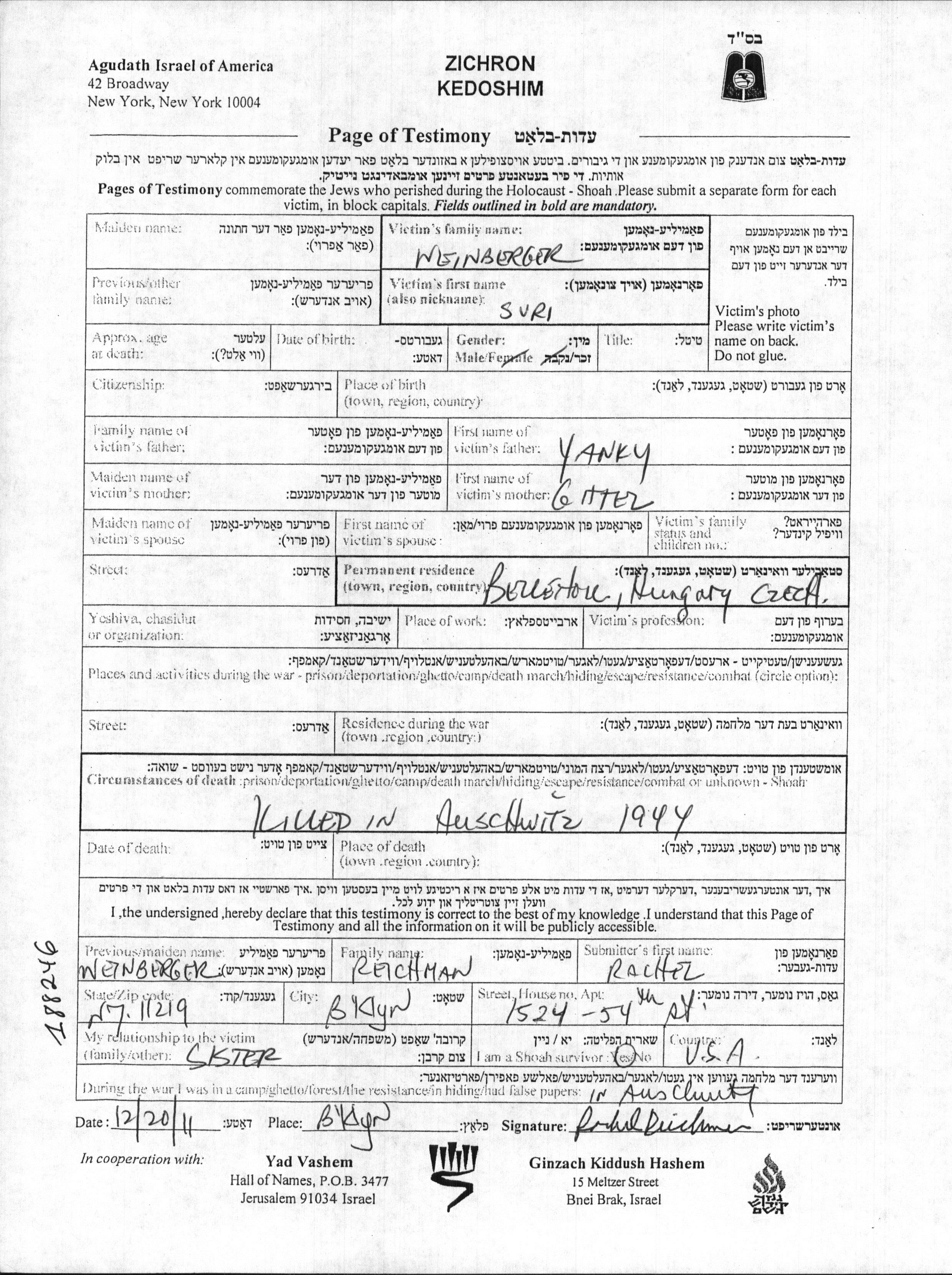Suri wurde in der Schoah ermordet. Todesort: Auschwitz, Polen im Jahr 1944.