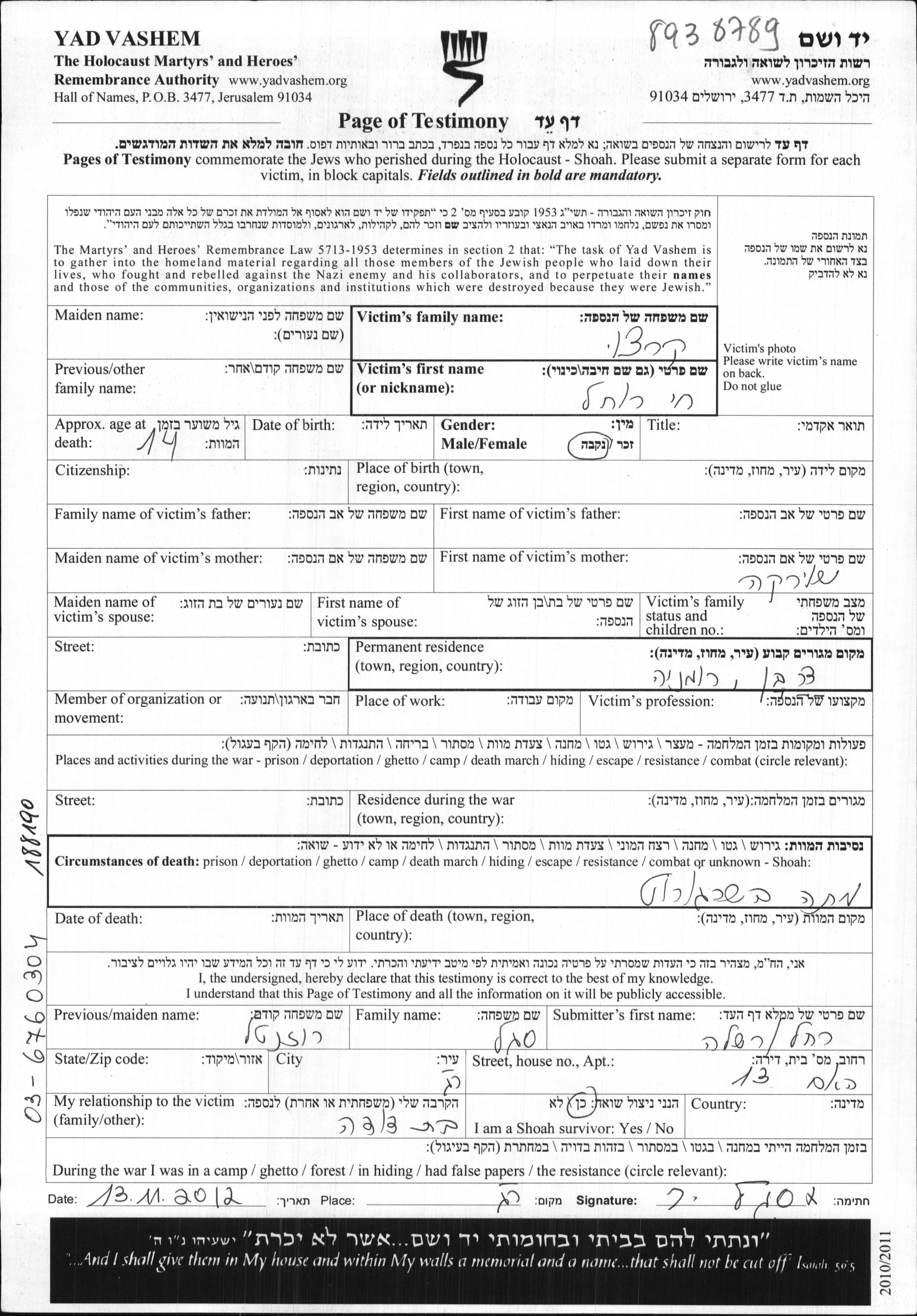 Khai Ruchla wurde in der Schoah ermordet. Todesort: Shargorod, Ukraine (UdSSR).