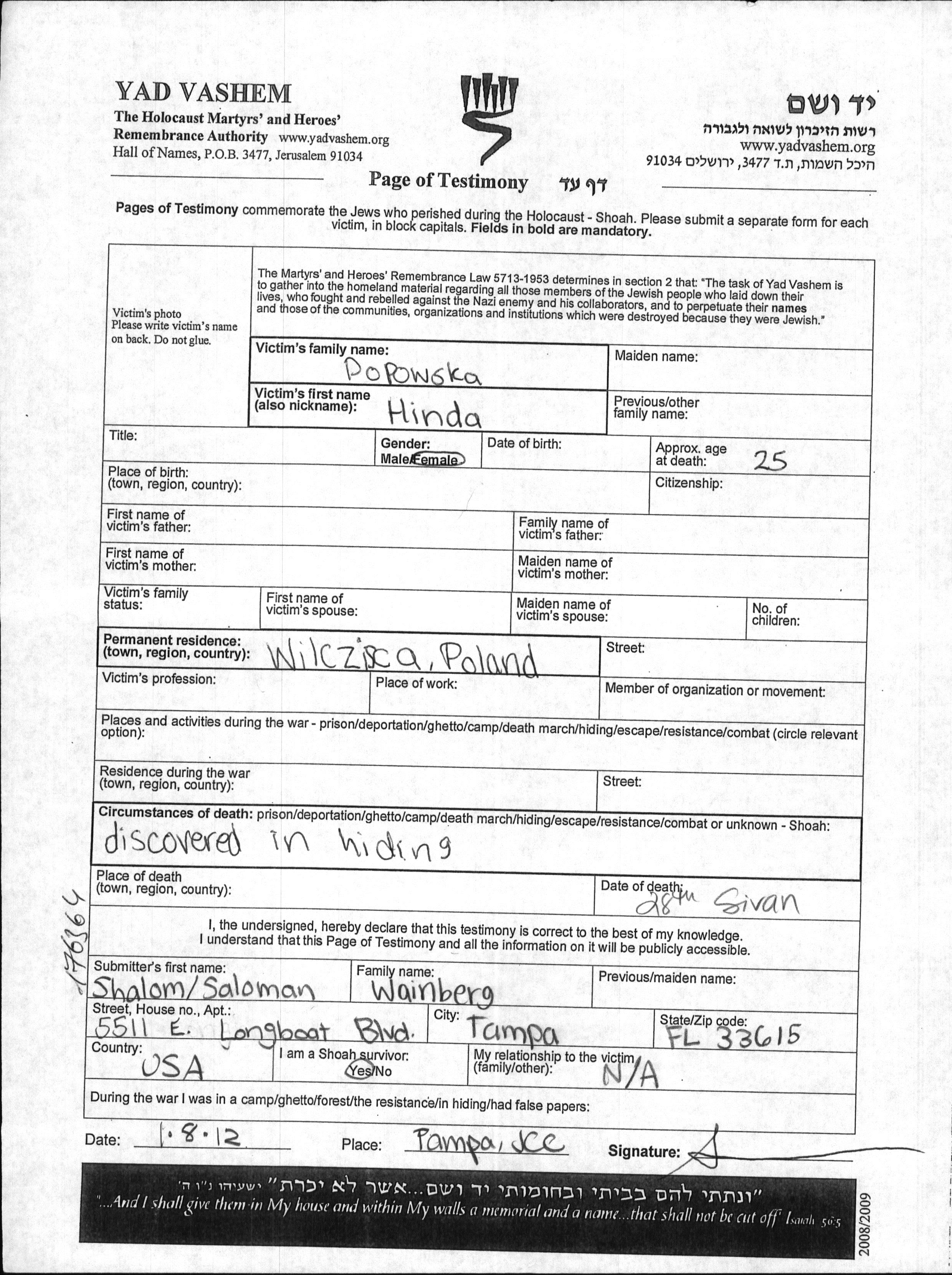 Hinda Popowska. Vor dem Zweiten Weltkrieg lebte sie in Wilczyska, Polen. Während des Krieges war sie in Wilczyska, Polen.