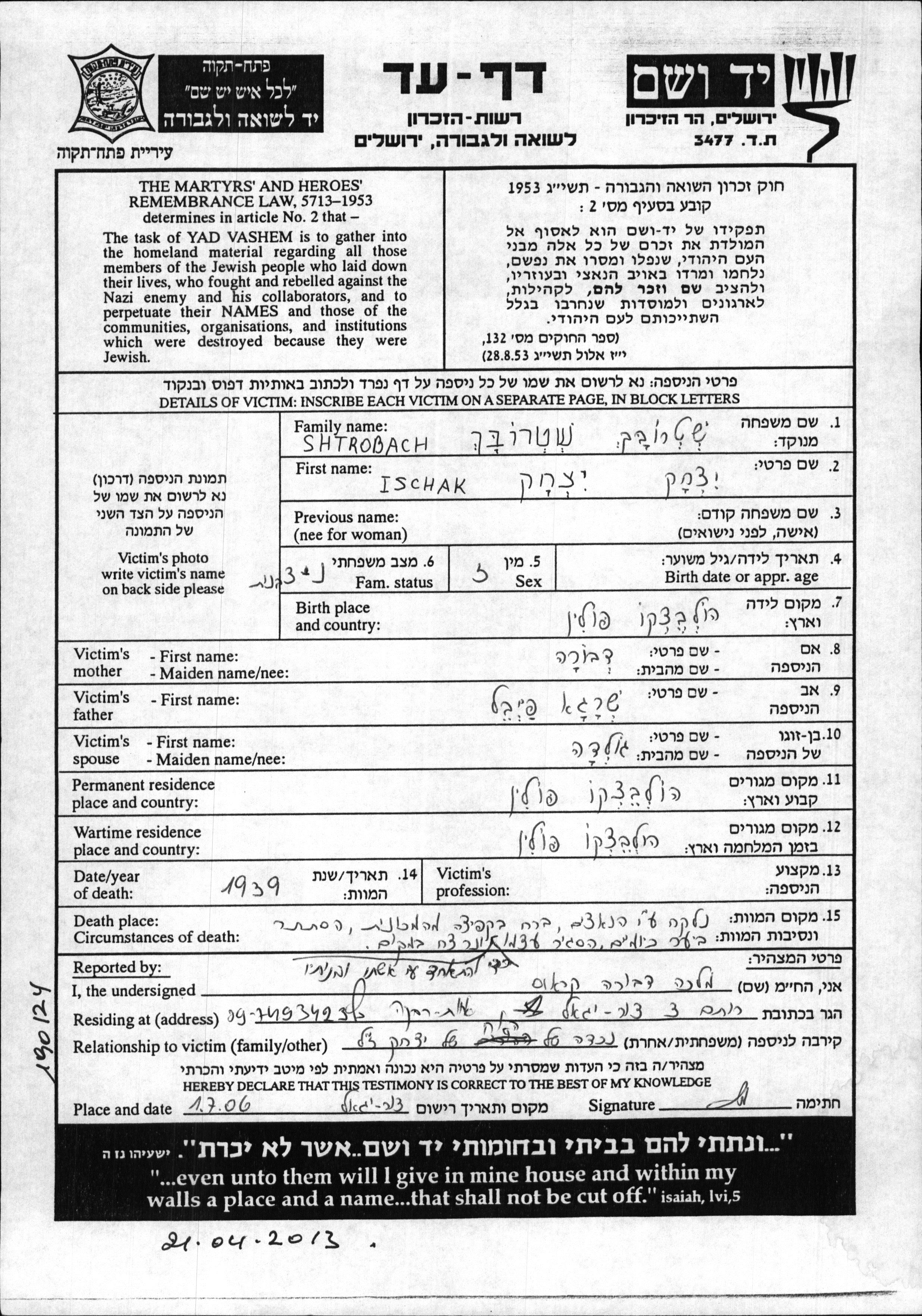 Ischak Shtrobach wurde in Holowiecko, Polen geboren. Er war der Sohn von Shraga Faivel und Dvora. Er war mit Golda Verheiratet. Vor dem Zweiten Weltkrieg lebte er in Holowiecko, Polen. Während des Krieges war er in Holowiecko, Polen.