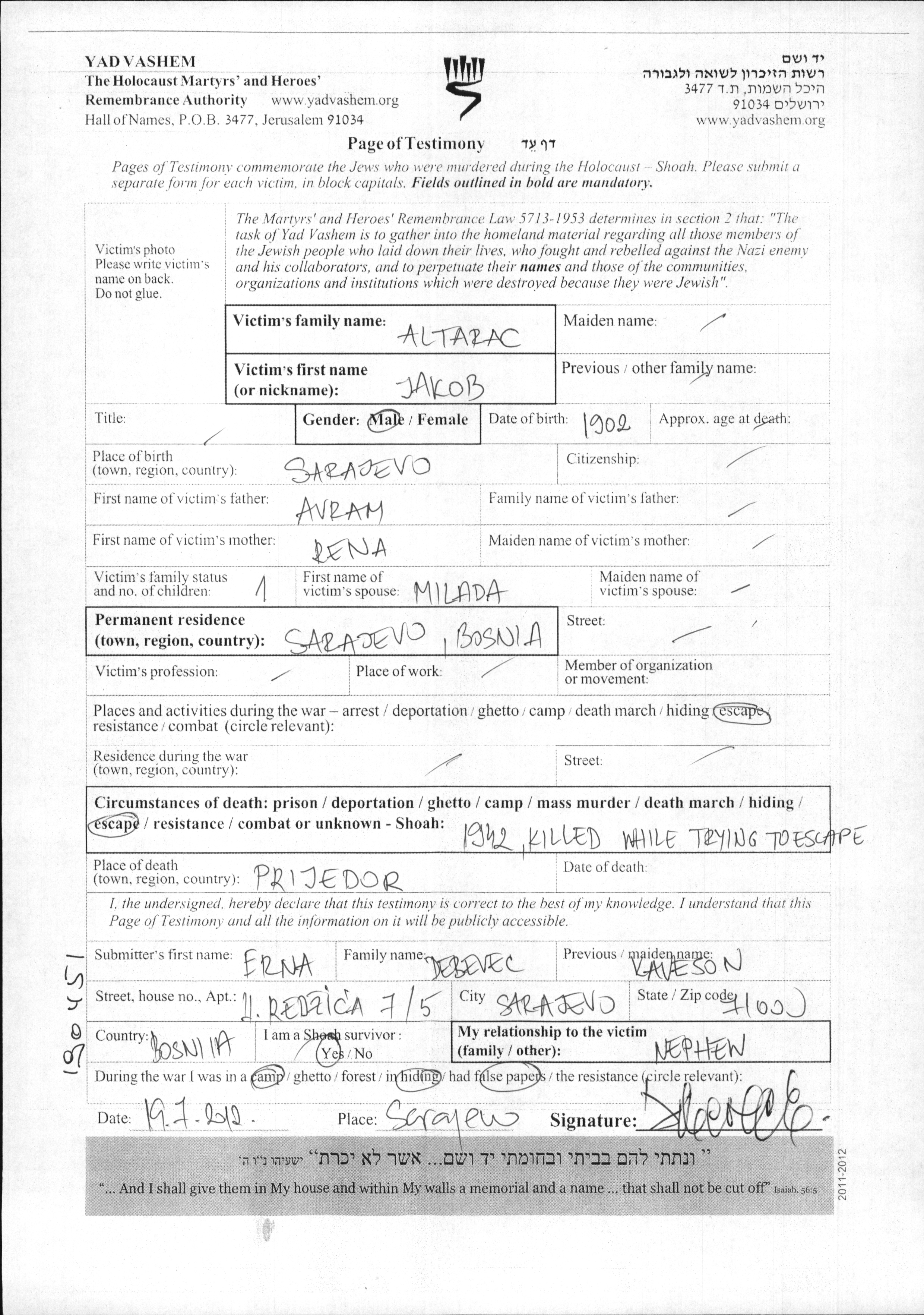 Jakob Altarac wurde im Jahr 1902 in Sarajevo, Jugoslawien geboren. Er war der Sohn von Avram und Rena. Er war mit Milada Verheiratet. Vor dem Zweiten Weltkrieg lebte er in Sarajevo, Jugoslawien. Während des Krieges war er in Sarajevo, Jugoslawien.
