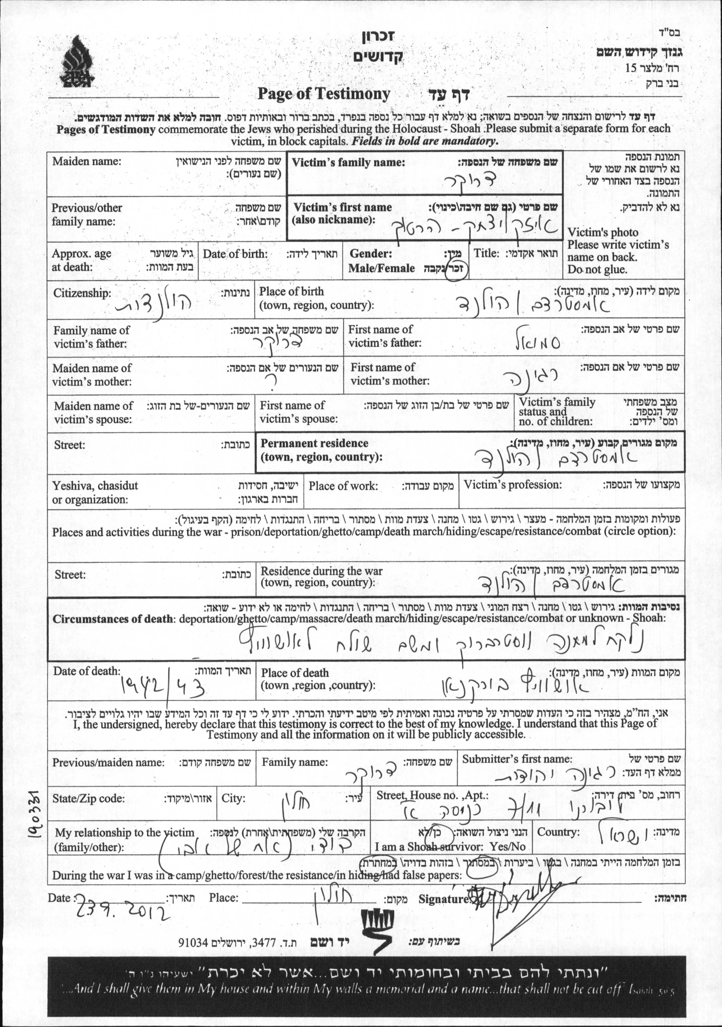 Izak Hertog wurde in der Schoah ermordet. Todesort: Auschwitz Birkenau, Polen im Jahr 1942.