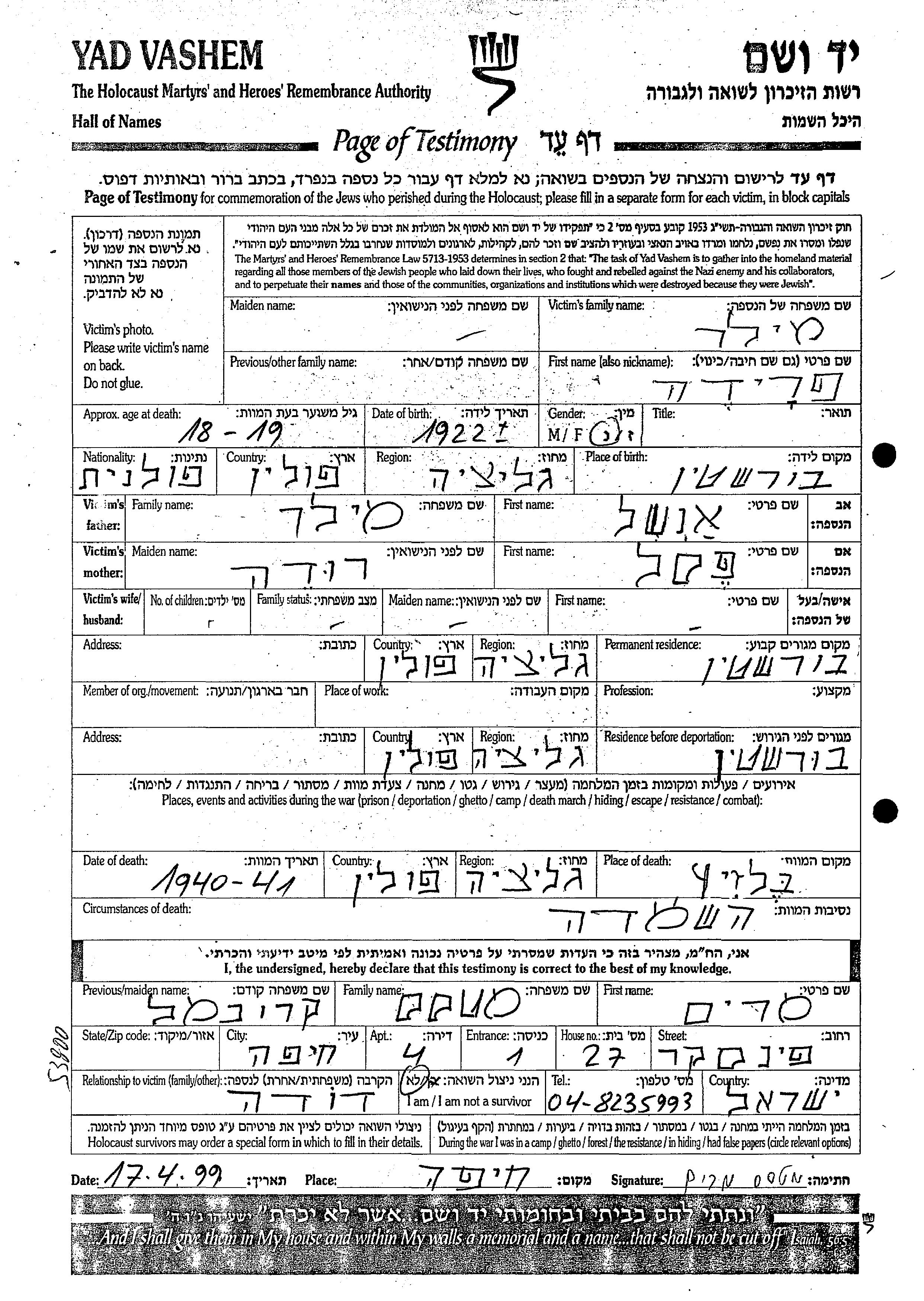 Frida wurde in der Schoah ermordet. Todesort: Belzica, Polen im Jahr 1940.