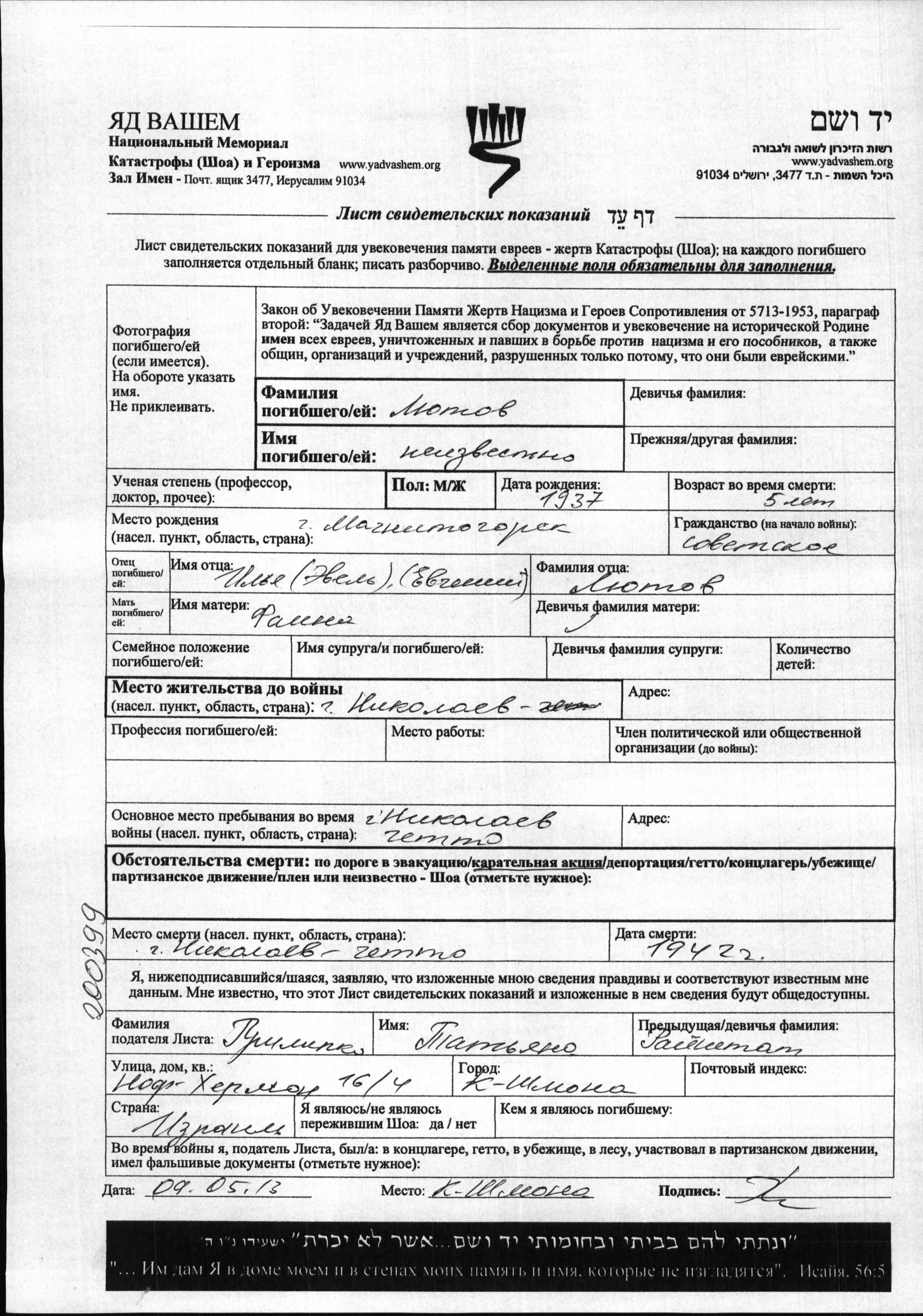 Vorname unbekannt Lyutov wurde im Jahr 1937 in Magnitogorsk, Russland (UdSSR) geboren. Er war der Sohn von Ilya Evel Yevgeniy und Faina. Er war Kind. Vor dem Zweiten Weltkrieg lebte er in Nikolayev, Ukraine (UdSSR). Während des Krieges war er in Getto.