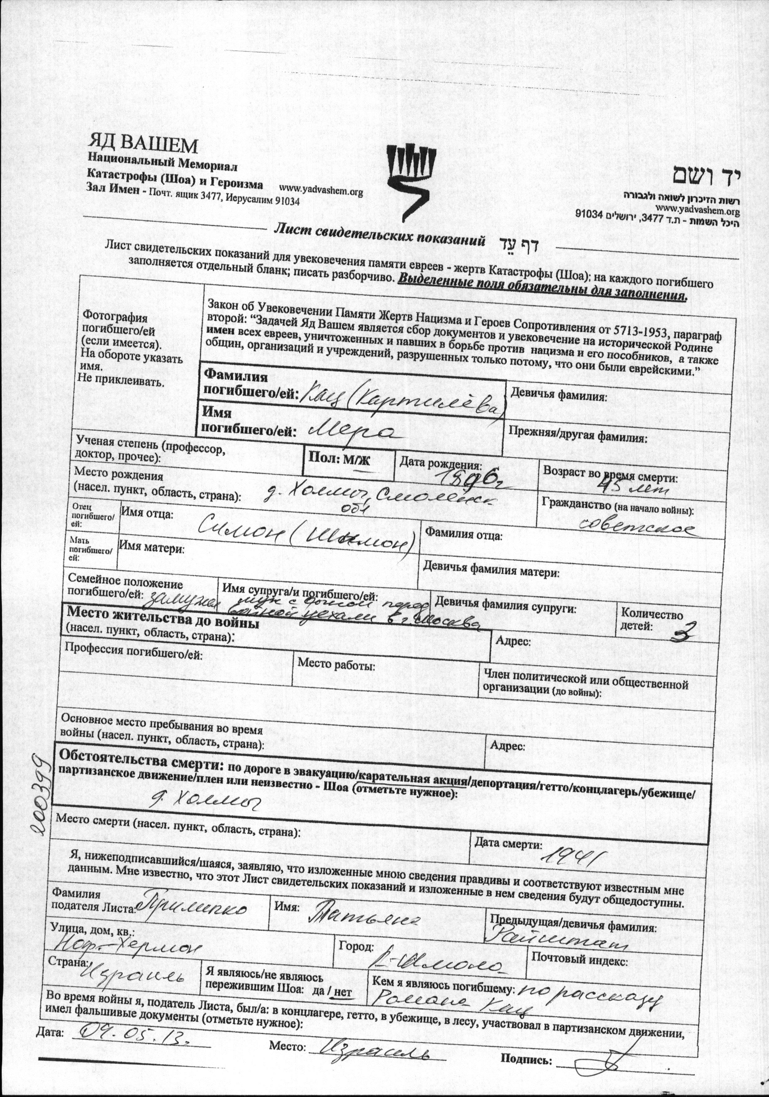 Mera Katz Karpileva wurde im Jahr 1896 in Kholmy, Russland (UdSSR) geboren. Sie war die Tochter von Simon. Sie war Verheiratet. Vor dem Zweiten Weltkrieg lebte sie in Kholmy, Russland (UdSSR). Während des Krieges war sie in Kholmy, Russland (UdSSR).
