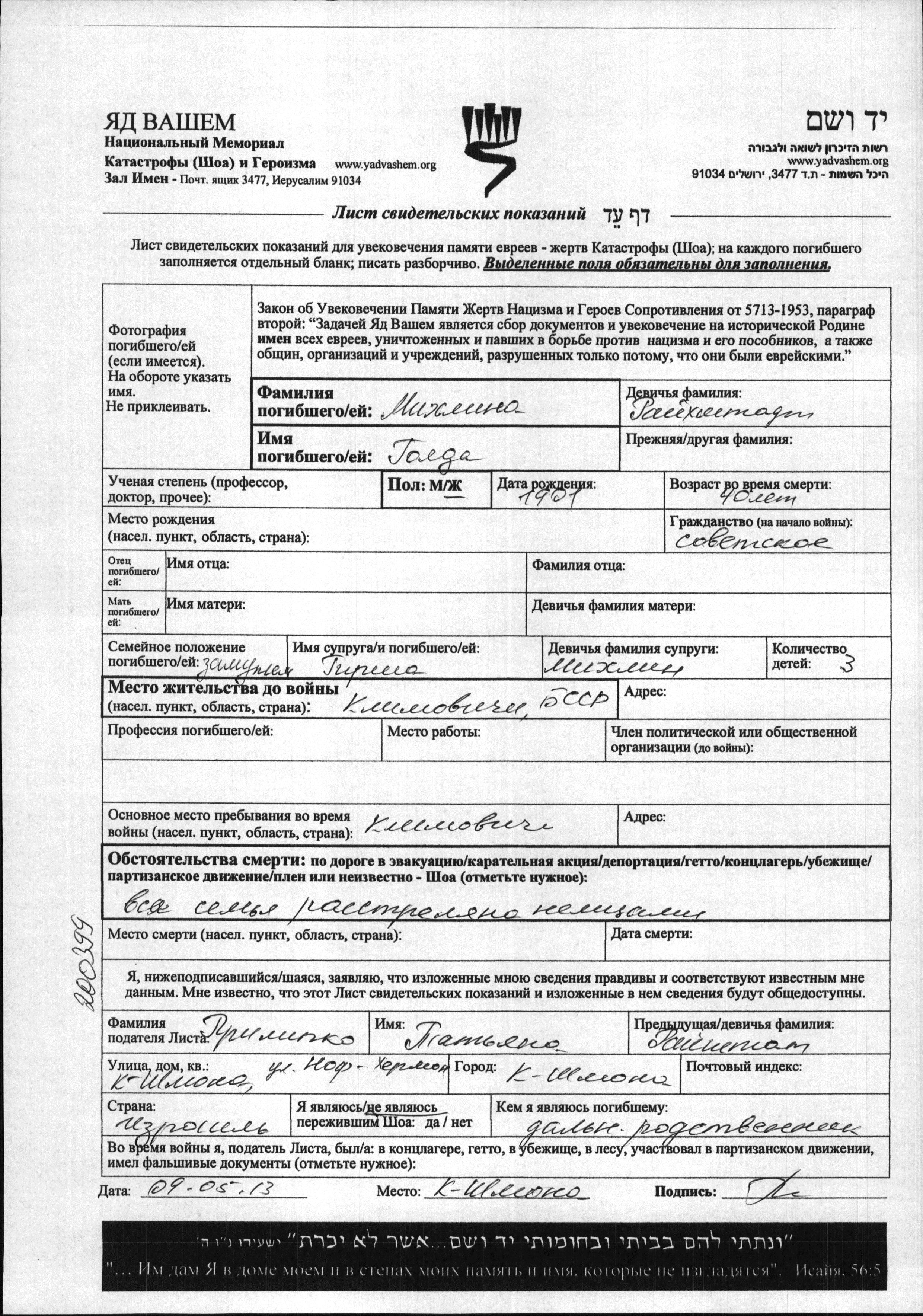 Golda Mikhlina, geb. Raykhshtadt wurde im Jahr 1901 geboren. Sie war mit Girsha Verheiratet. Vor dem Zweiten Weltkrieg lebte sie in Klimovichi, Weißrussland (UdSSR). Während des Krieges war sie in Klimovichi, Weißrussland (UdSSR).