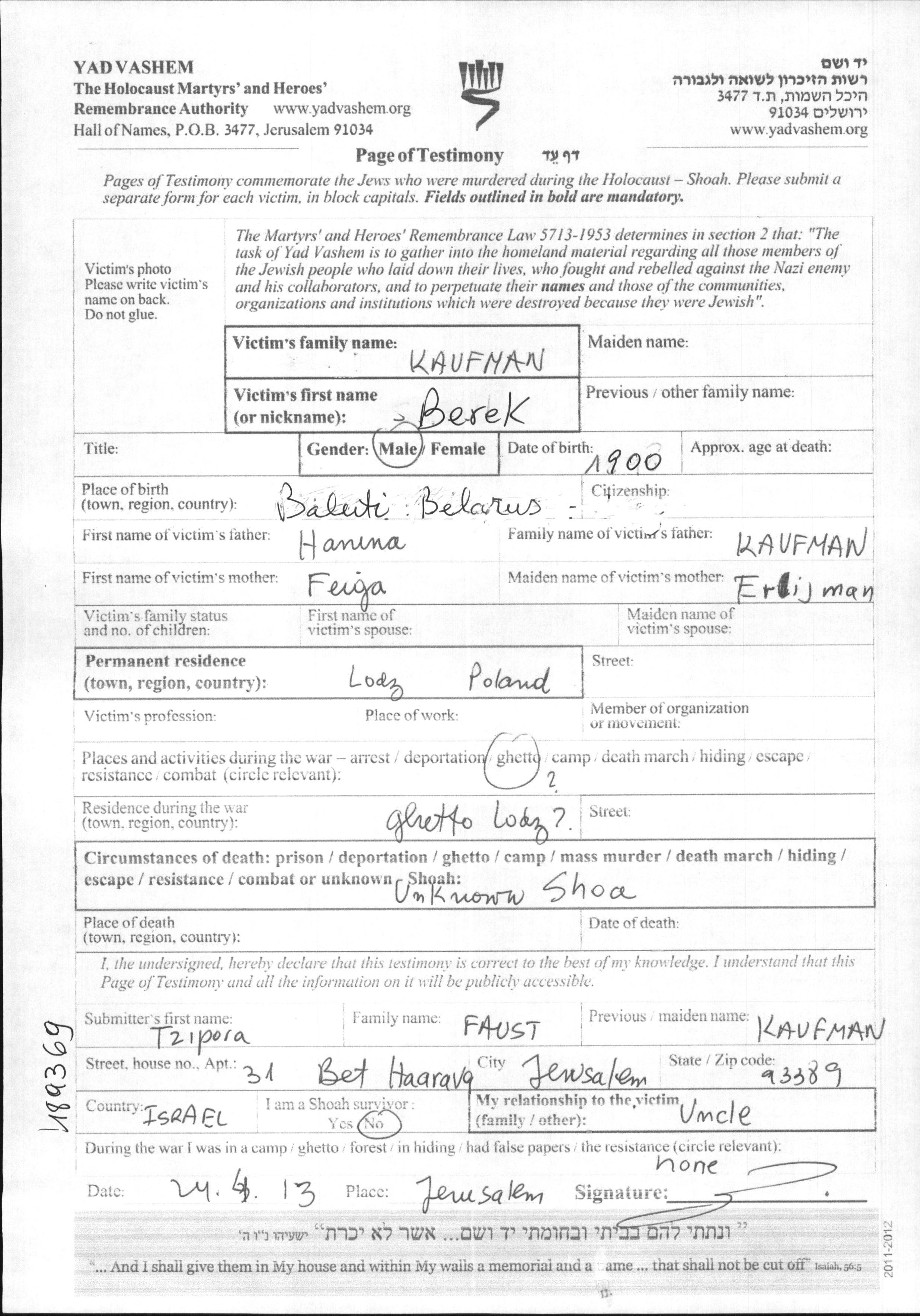 Berek Kaufman wurde im Jahr 1900 in Baluty, Polen geboren. Er war der Sohn von Hanina und Feiga, geb. Erlijman. Vor dem Zweiten Weltkrieg lebte er in Lodz, Polen. Während des Krieges war er in Lodz, Polen.