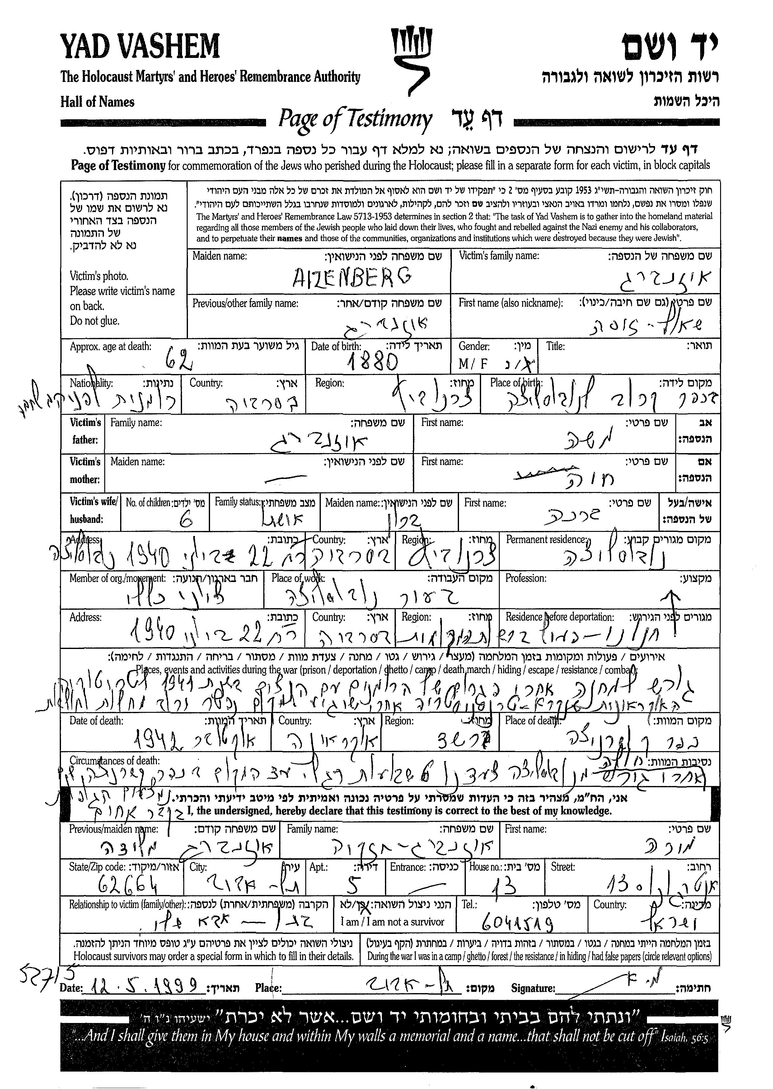 Shaul Zusa Aizenberg wurde im Jahr 1880 in Novoselica, Rumänien geboren. Er war der Sohn von Moshe und Khaia. Er war Lebensmittelhändler/-in und mit Brakha, geb. Brun Verheiratet. Vor dem Zweiten Weltkrieg lebte er in Novoselica, Rumänien. Während des Krieges war er in Novoselica, Rumänien.
