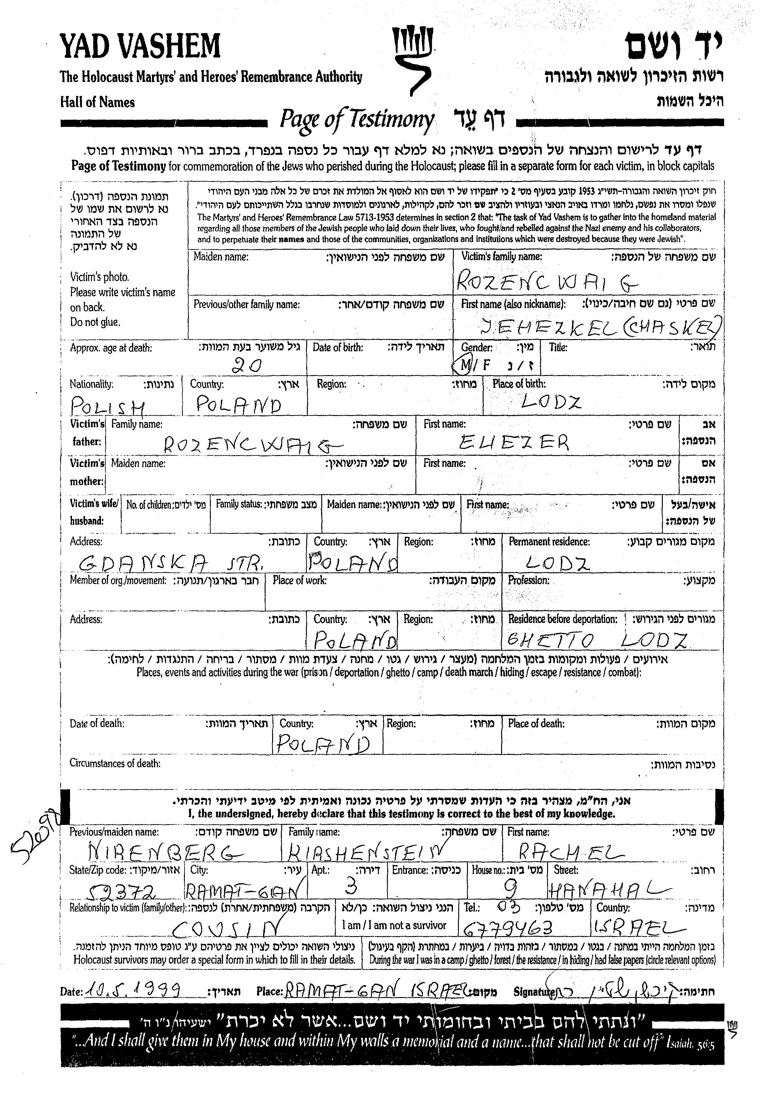 Jehezkel Rozencwaig wurde in Lodz, Polen geboren. Er war der Sohn von Eliezer. Vor dem Zweiten Weltkrieg lebte er in Lodz, Polen. Während des Krieges war er in Lodz, Polen.