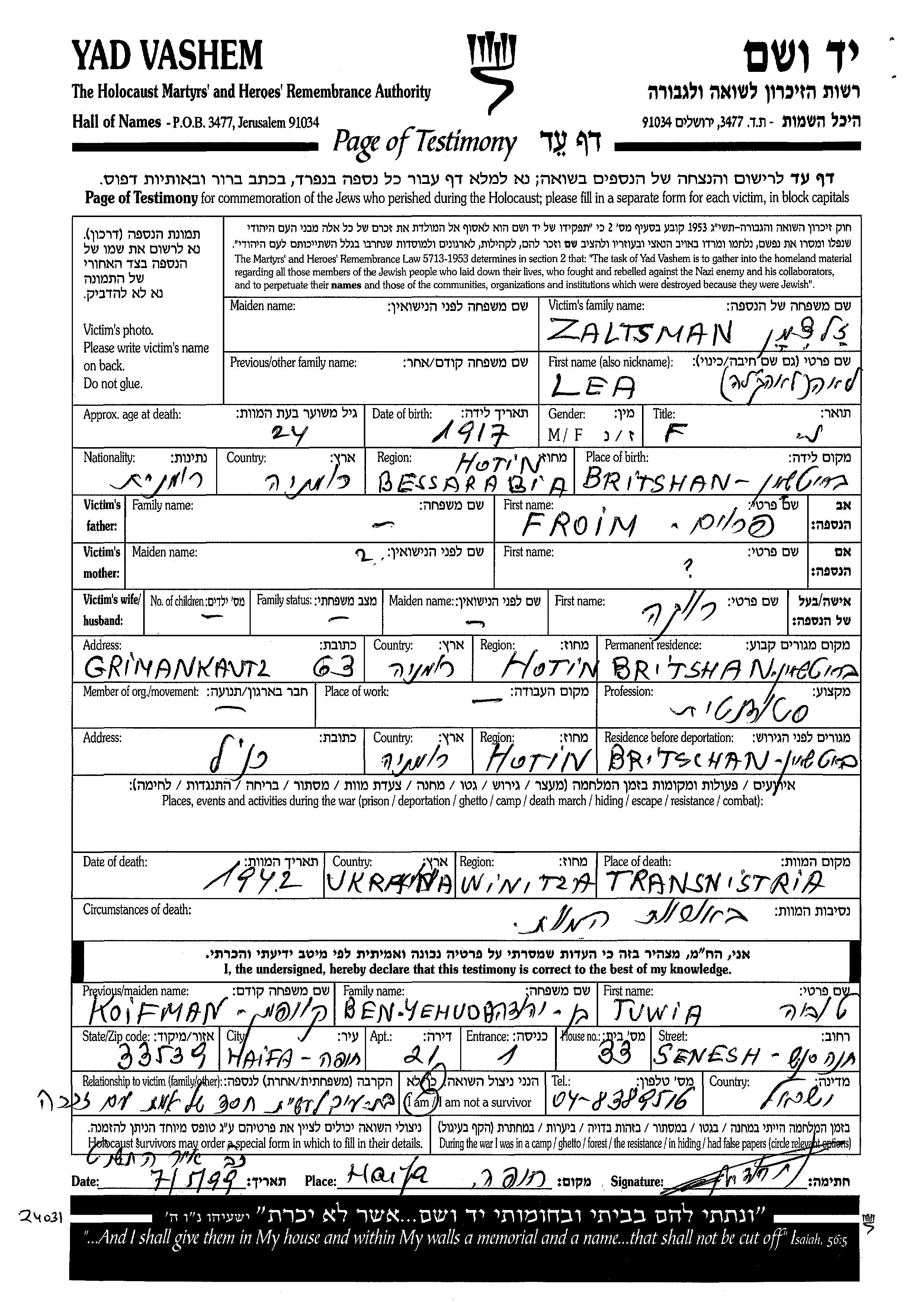 Zaltsman Lea 1917 Britshan, Rumänien Gedenkblatt