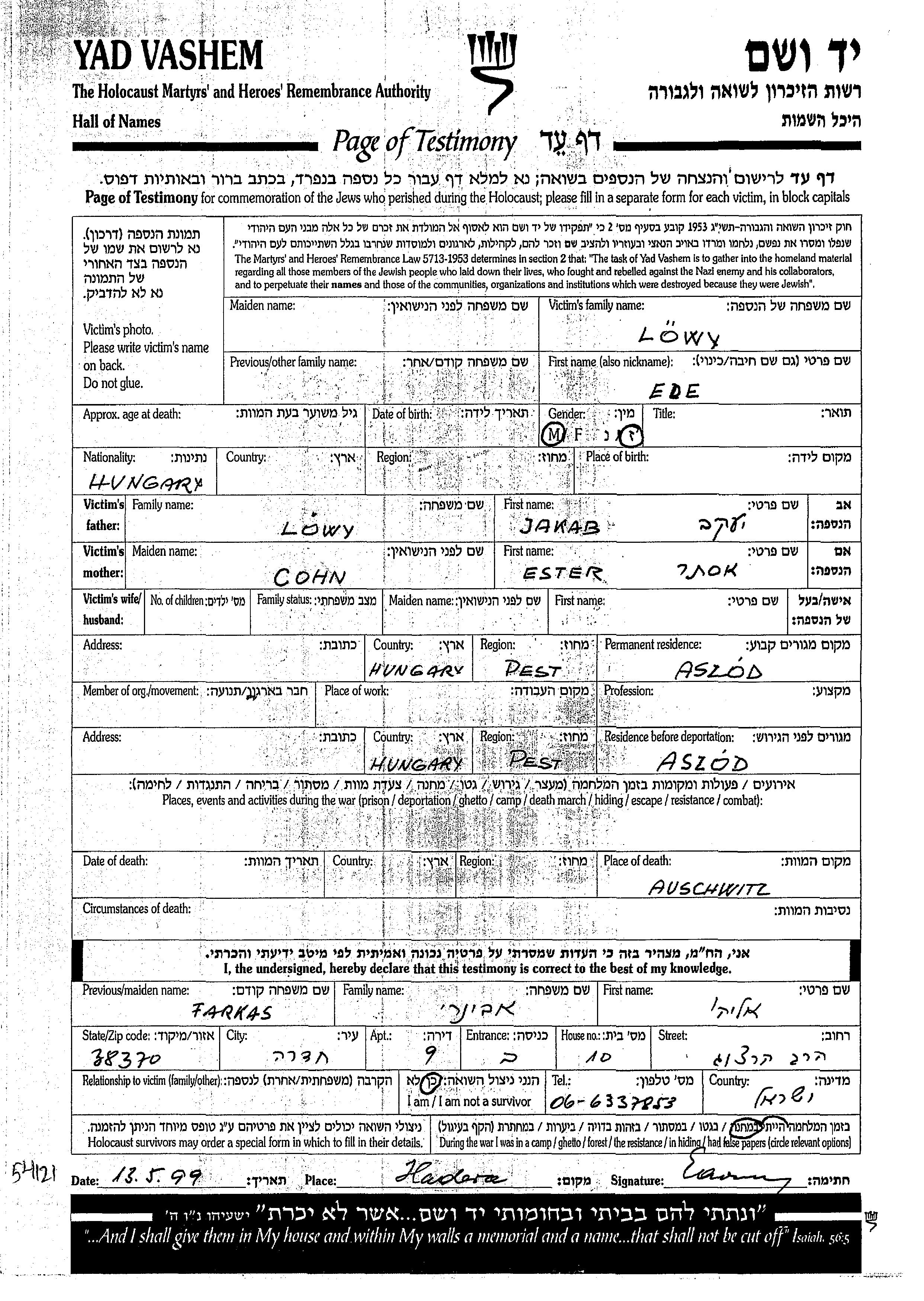 Ede Löwy wurde in Ungarn geboren. Er war der Sohn von Jakab und Ester. Vor dem Zweiten Weltkrieg lebte er in Aszod, Ungarn. Während des Krieges war er in Aszod, Ungarn.