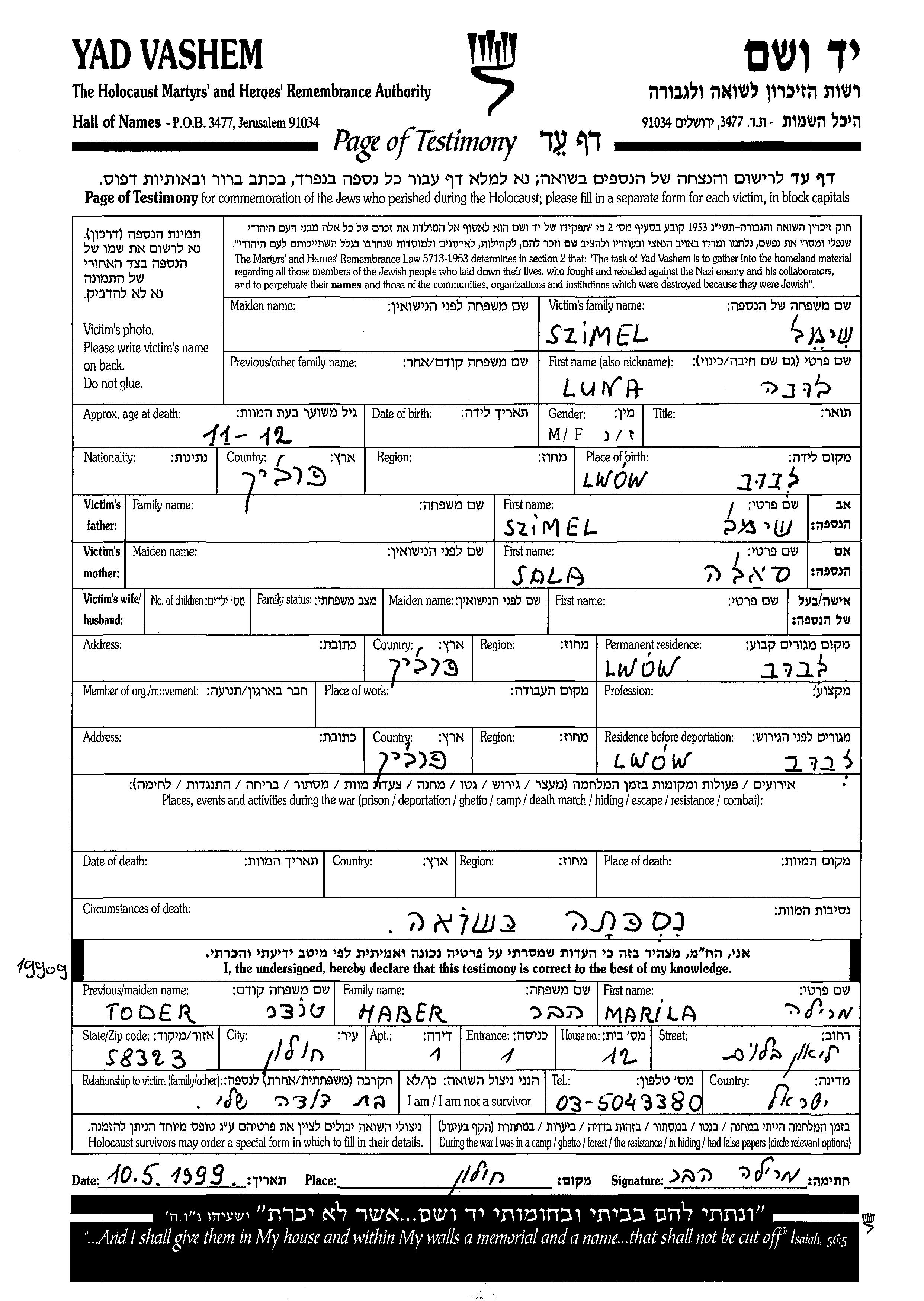 Luna Szimel wurde in Lwow, Polen geboren. Sie war die Tochter von Shulamit. Sie war Kind. Vor dem Zweiten Weltkrieg lebte sie in Lwow, Polen. Während des Krieges war sie in Lwow, Polen.
