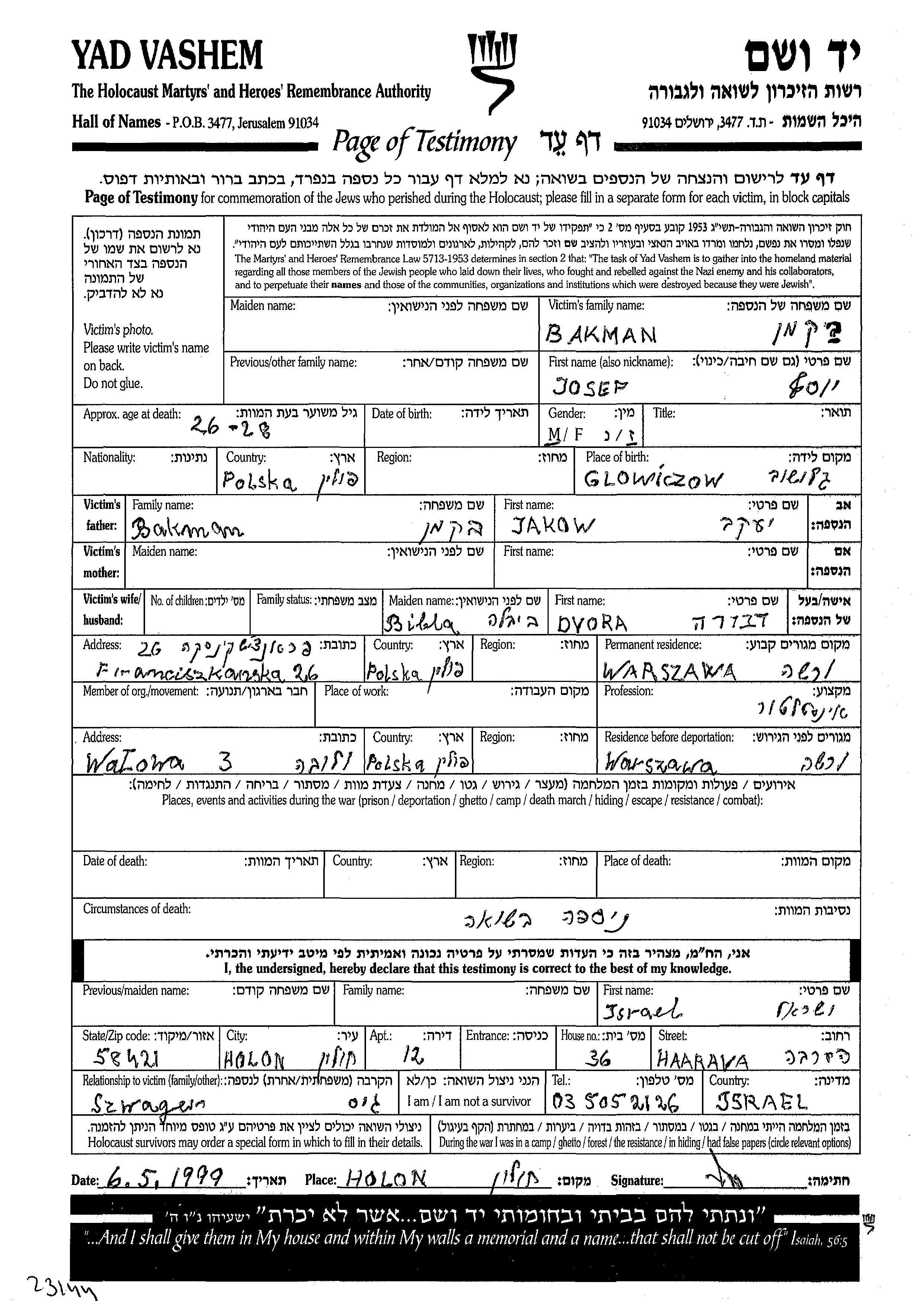 Josef Bakman Bekman wurde in Glowiczow, Polen geboren. Er war der Sohn von Jakow. Er war Klempner und mit Dvora, geb. Bibla Verheiratet. Vor dem Zweiten Weltkrieg lebte er in Warsaw, Polen. Während des Krieges war er in Warsaw, Polen.