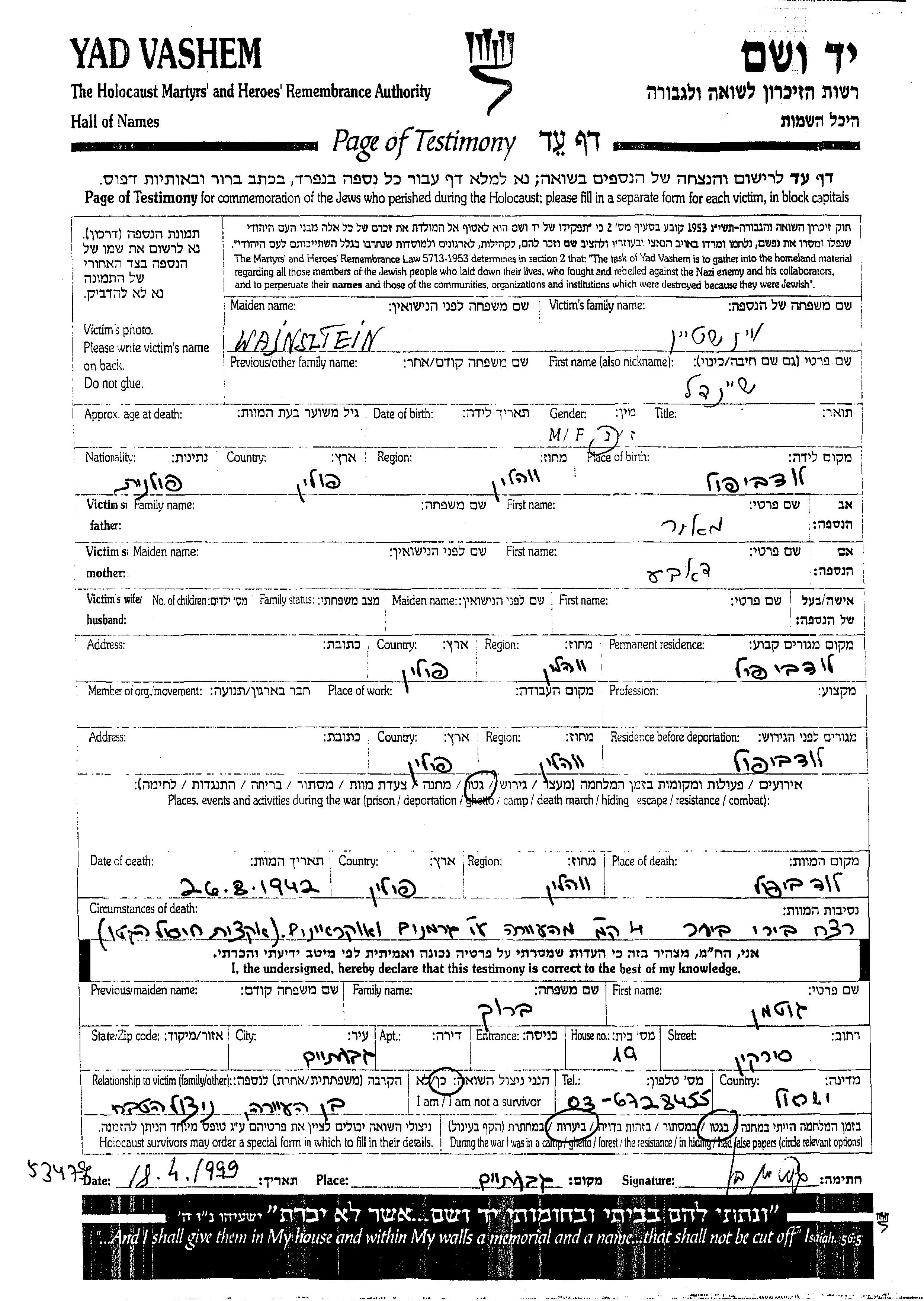 Wajnsztein Sheindl Ludwipol, Polen Gedenkblatt