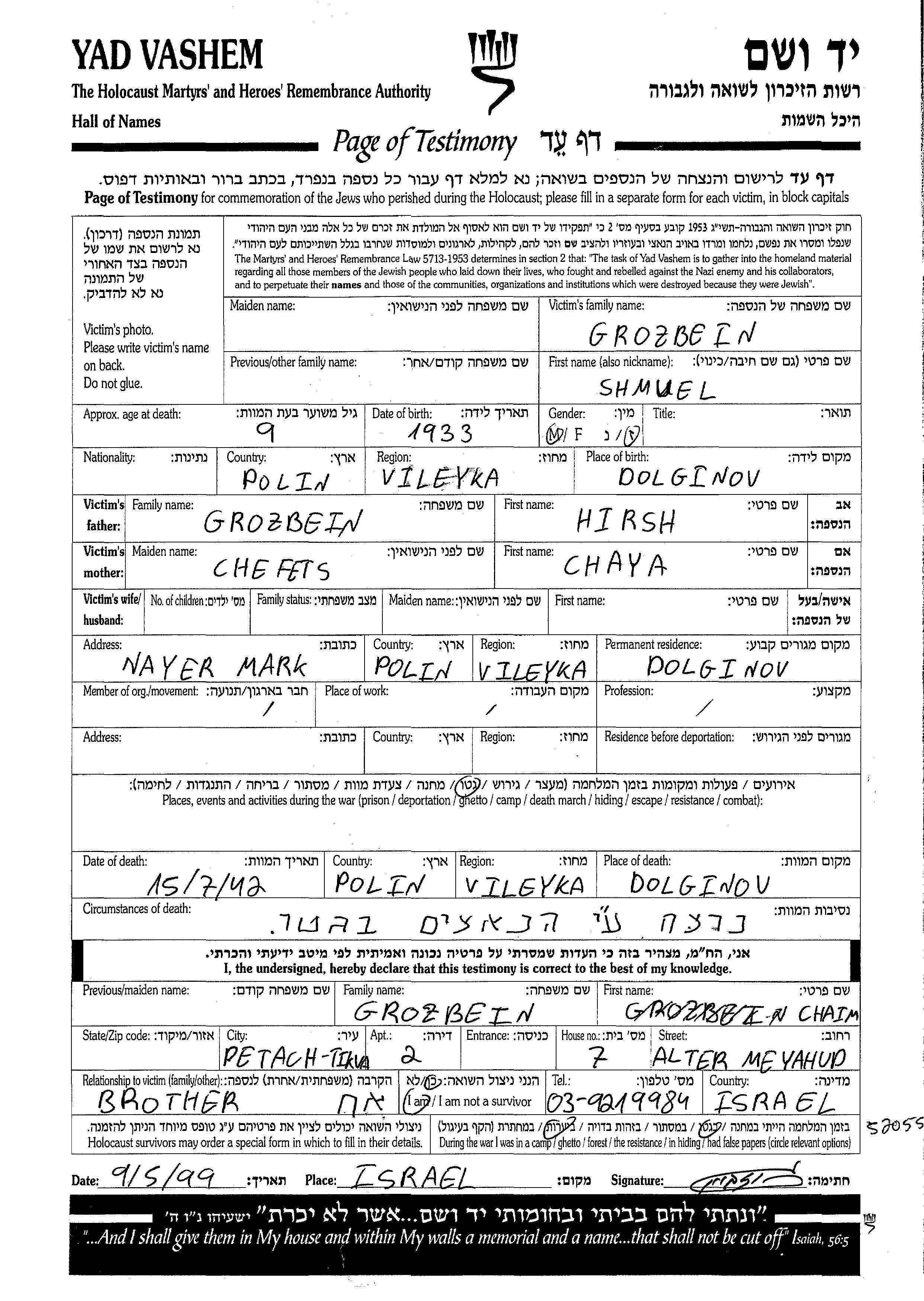 Shmuel wurde in der Schoah ermordet. Todesort: Dolginovo, Polen im Jahr 15/07/1942.