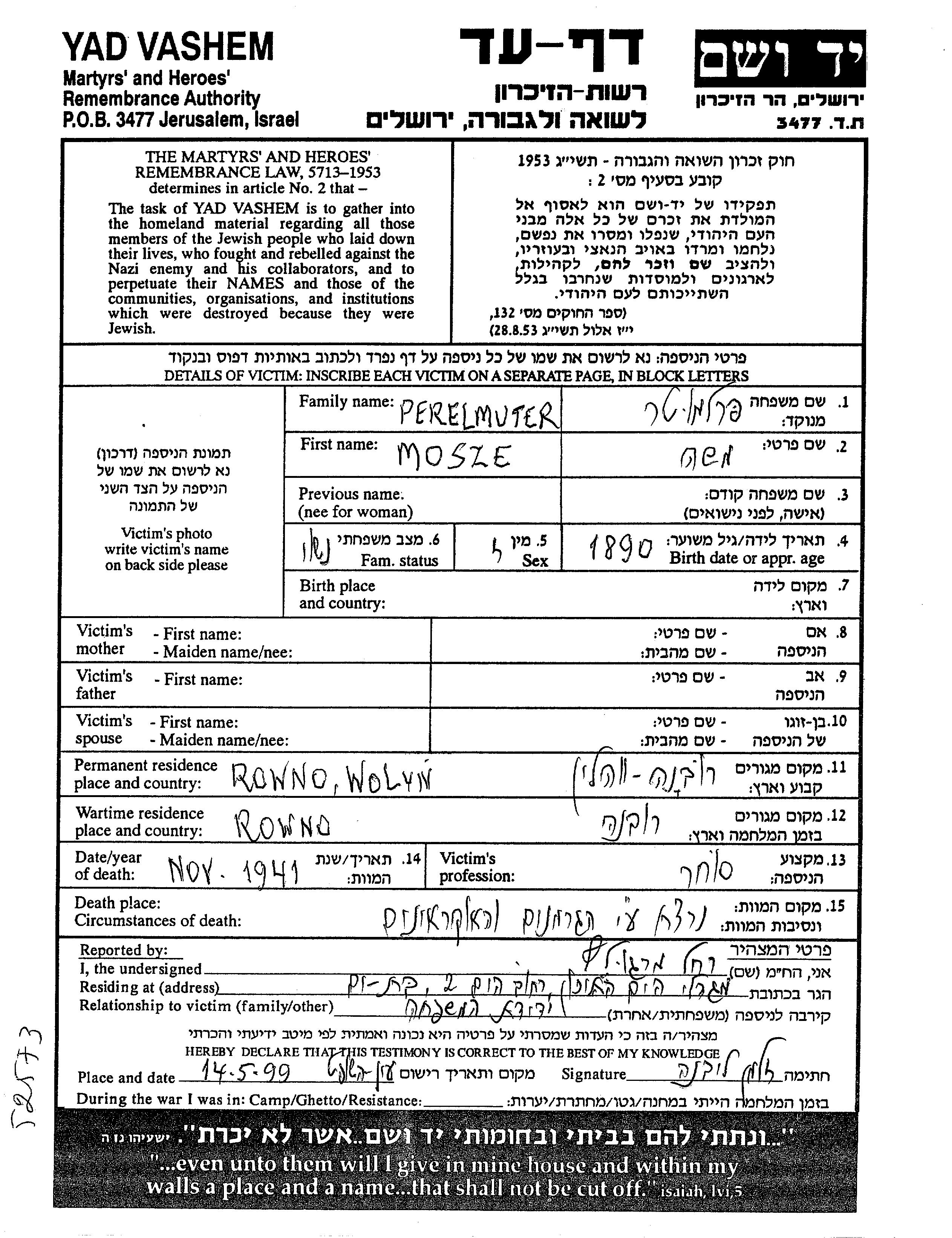 Mosze Perlmuter wurde im Jahr 1890 geboren. Er war Kaufmann/-frau und Verheiratet. Vor dem Zweiten Weltkrieg lebte er in Rowno, Polen. Während des Krieges war er in Rowno, Polen.