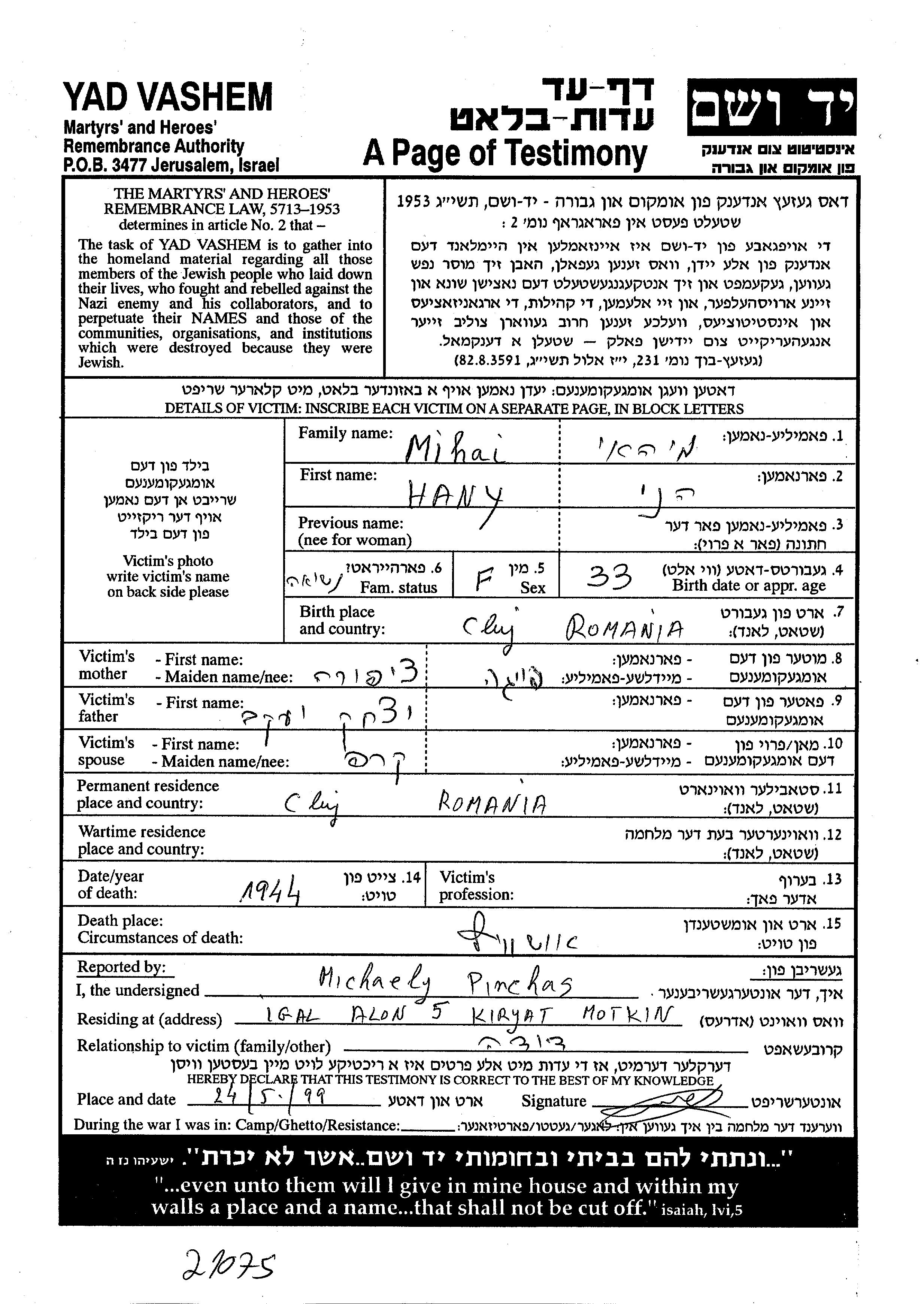Hany wurde in der Schoah ermordet. Todesort: Auschwitz, Polen im Jahr 1944.