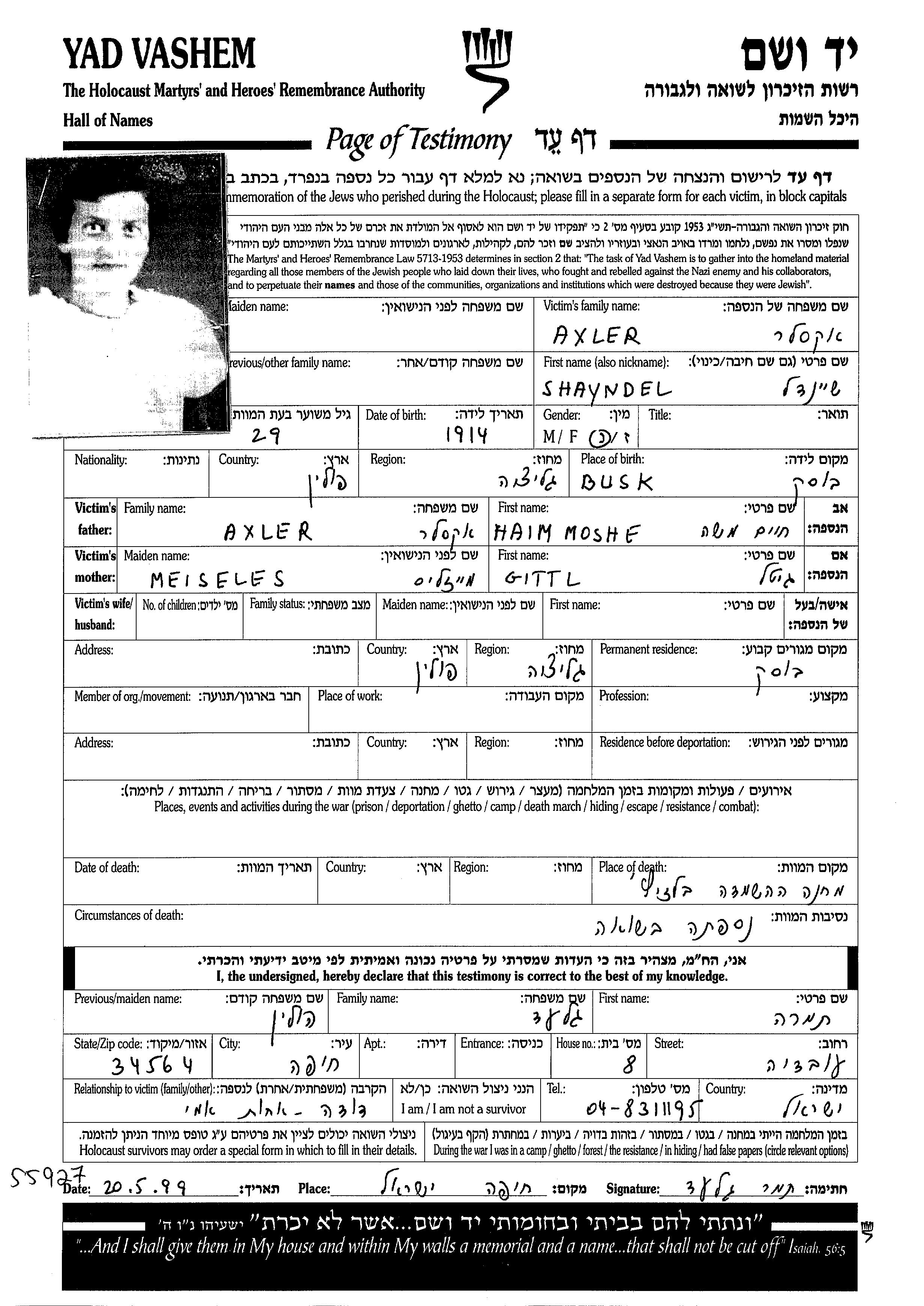 Axler Shayndel 1914 Busk, Polen Gedenkblatt