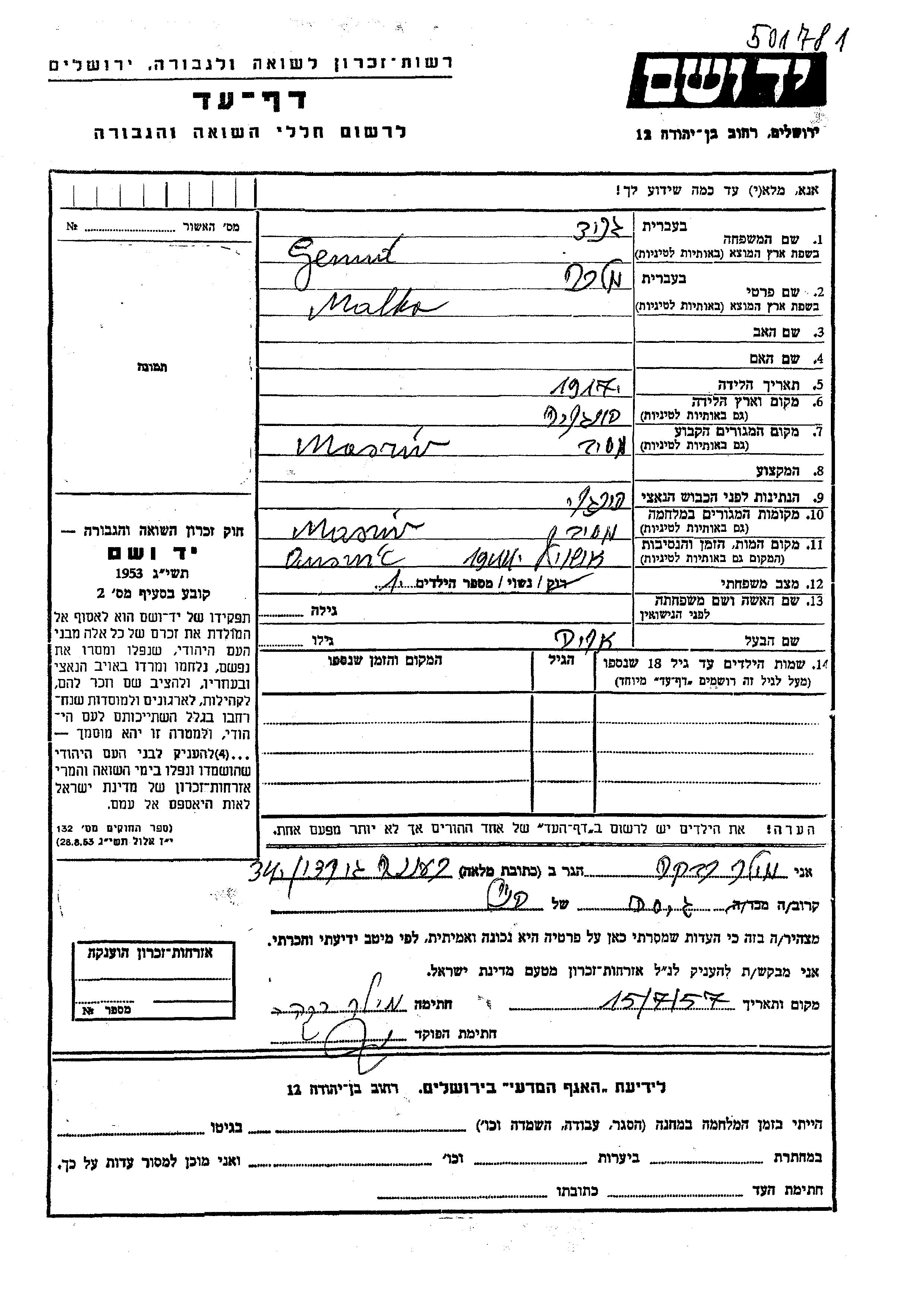 Malka Genud wurde im Jahr 1917 in Ungarn geboren. Sie war mit Arie Verheiratet. Vor dem Zweiten Weltkrieg lebte sie in Masiw, Rumänien. Während des Krieges war sie in Masiw, Rumänien.