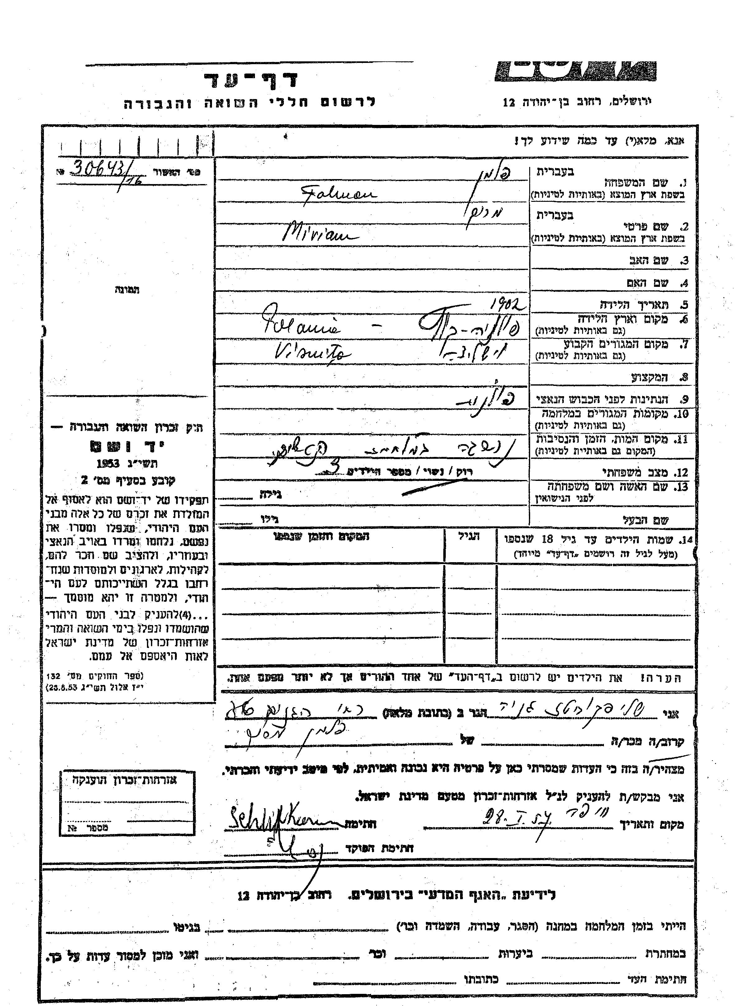 Miriam Falman Felman wurde im Jahr 1902 in Kielce, Polen geboren. Sie war Verheiratet. Vor dem Zweiten Weltkrieg lebte sie in Vishnitsa, Polen.