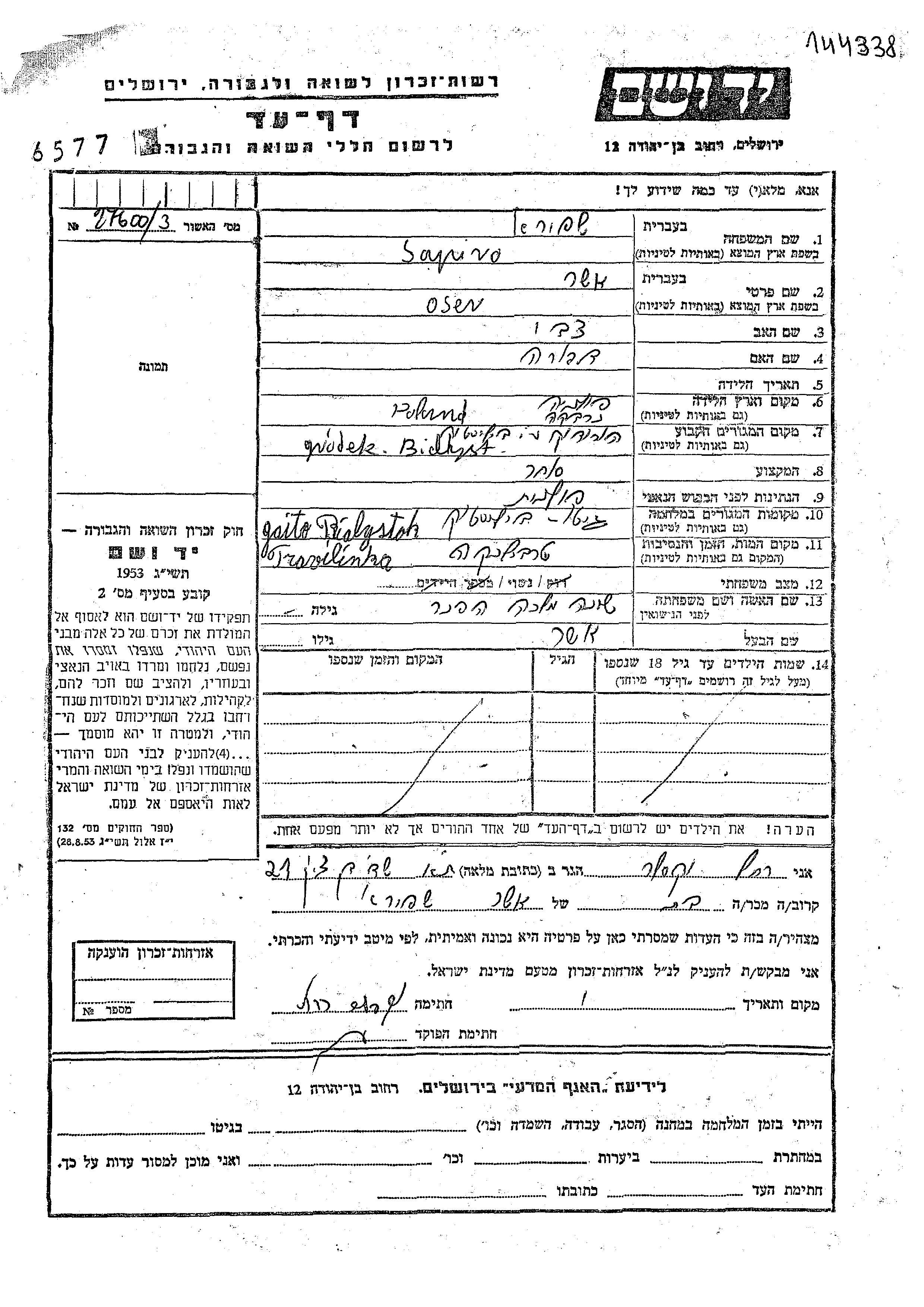 Oser Sapiro wurde in Gródek, Polen geboren. Er war der Sohn von Tzvi und Tzipora. Er war Kaufmann/-frau und mit Shuna Malka, geb. Hafner Verheiratet. Vor dem Zweiten Weltkrieg lebte er in Gródek, Polen. Während des Krieges war er in Bialystok, Polen.