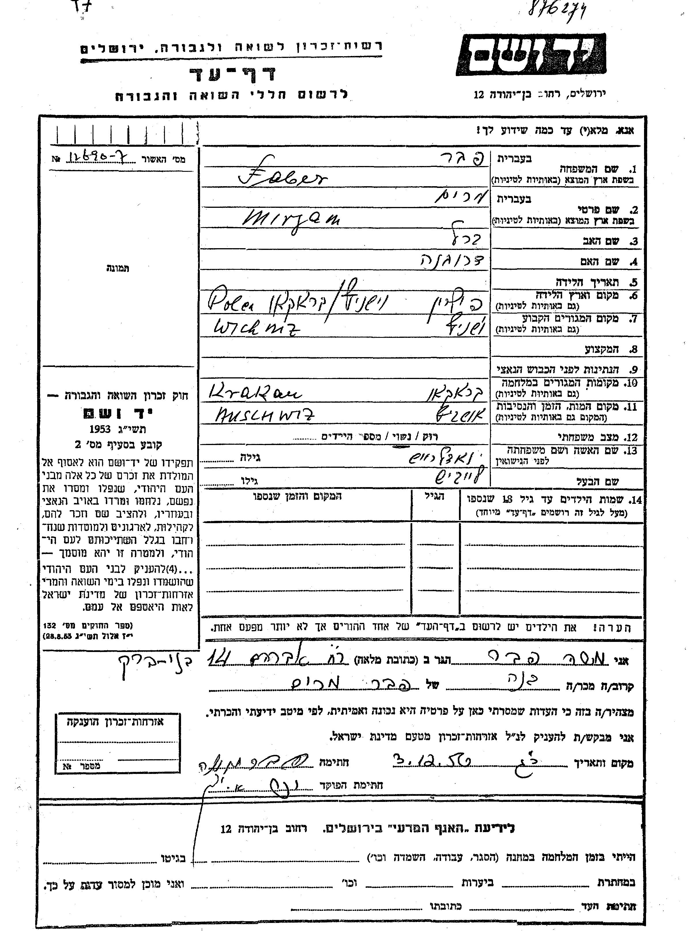 Mirjam Faber, geb. Nadelreikh wurde in Wisnicz, Polen geboren. Sie war die Tochter von Berl und Drobna. Sie war mit Leibish Verheiratet. Vor dem Zweiten Weltkrieg lebte sie in Wisnicz, Polen. Während des Krieges war sie in Krakow, Polen.