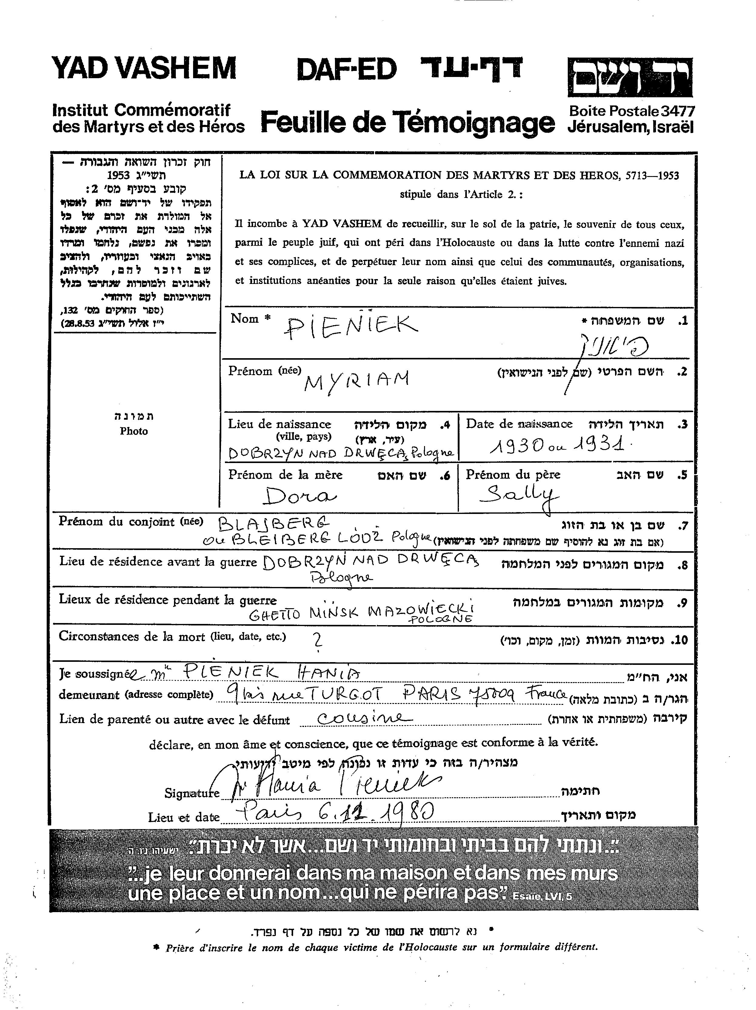 Myriam Pieniek Pienik wurde im Jahr 1930 in Dobrzyn nad Drweca, Polen geboren. Sie war die Tochter von Sally und Dora. Sie war Kind. Vor dem Zweiten Weltkrieg lebte sie in Dobrzyn nad Drweca, Polen. Während des Krieges war sie in Minsk Mazowiecki, Polen.