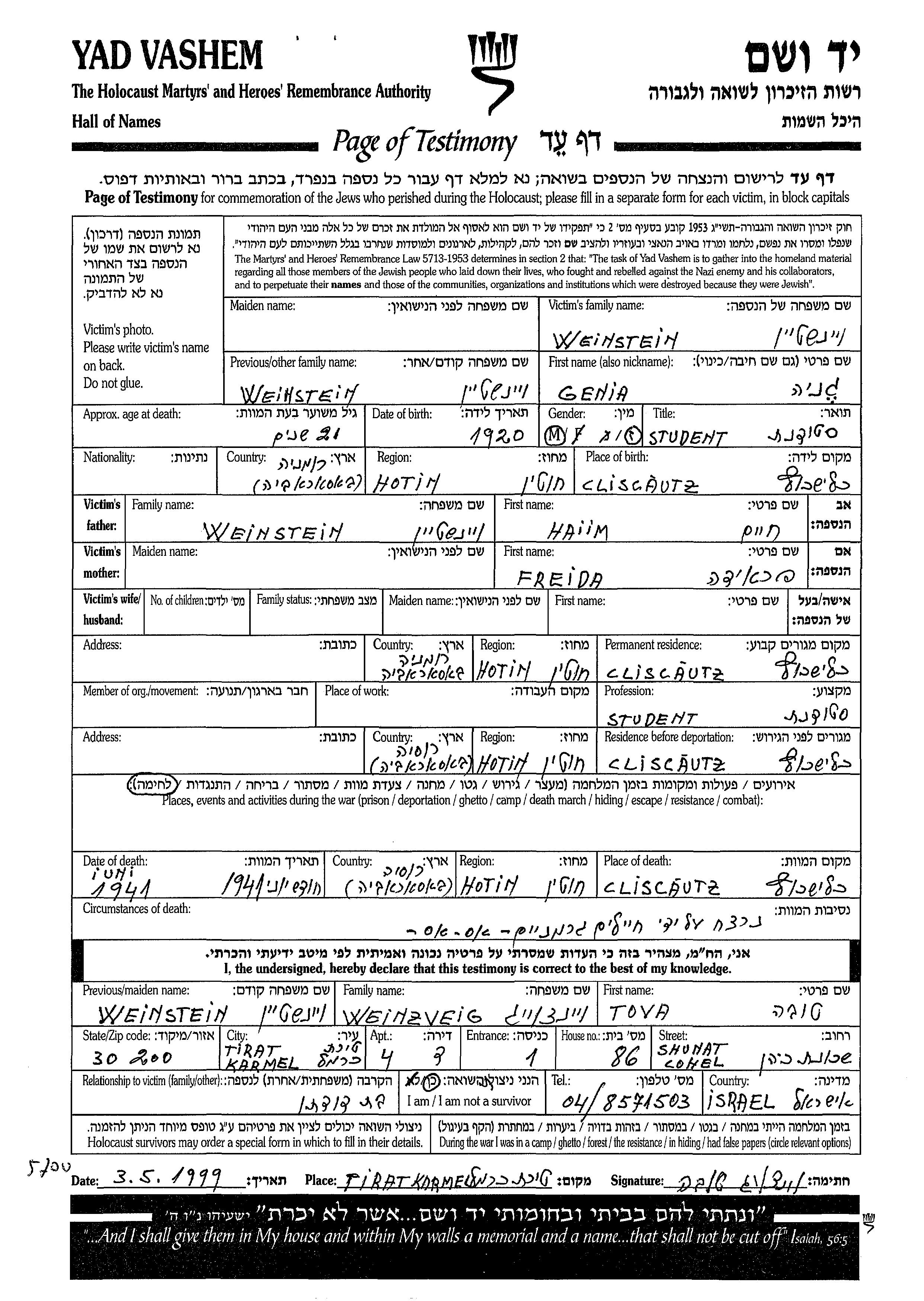 Genia Weinstein wurde im Jahr 1920 in Cliscauti, Rumänien geboren. Sie war die Tochter von Haiim und Fraida Freida. Sie war Student. Vor dem Zweiten Weltkrieg lebte sie in Cliscauti, Rumänien. Während des Krieges war sie in Cliscauti, Rumänien.