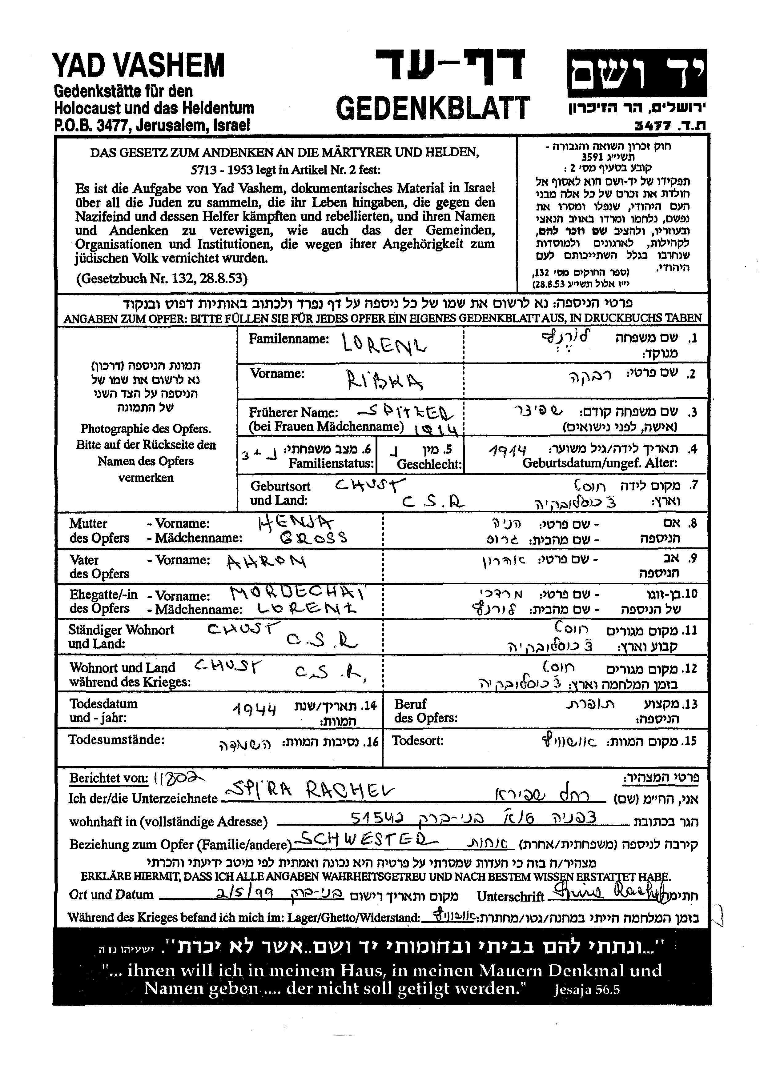 Rivka Lorentz, geb. Spitzer wurde im Jahr 1914 in Chust, Tschechoslowakei geboren. Sie war die Tochter von Ahron und Henja Henia. Sie war Schneiderin und mit Mordechai Verheiratet. Vor dem Zweiten Weltkrieg lebte sie in Chust, Tschechoslowakei. Während des Krieges war sie in Chust, Tschechoslowakei.